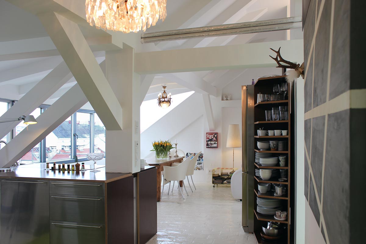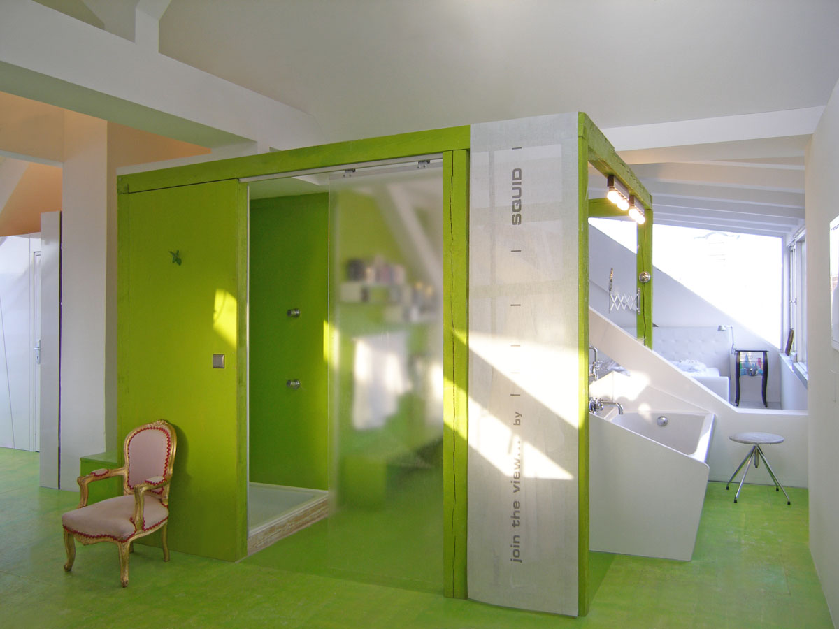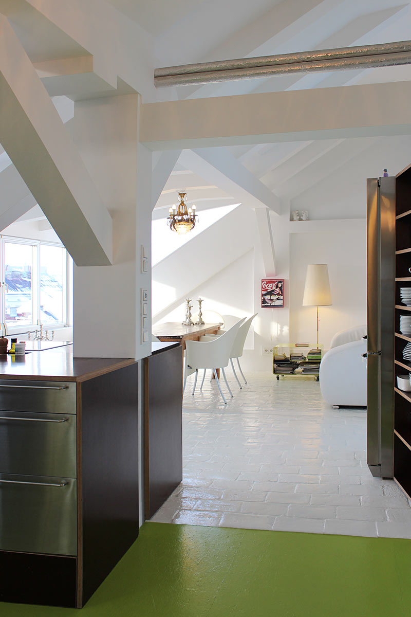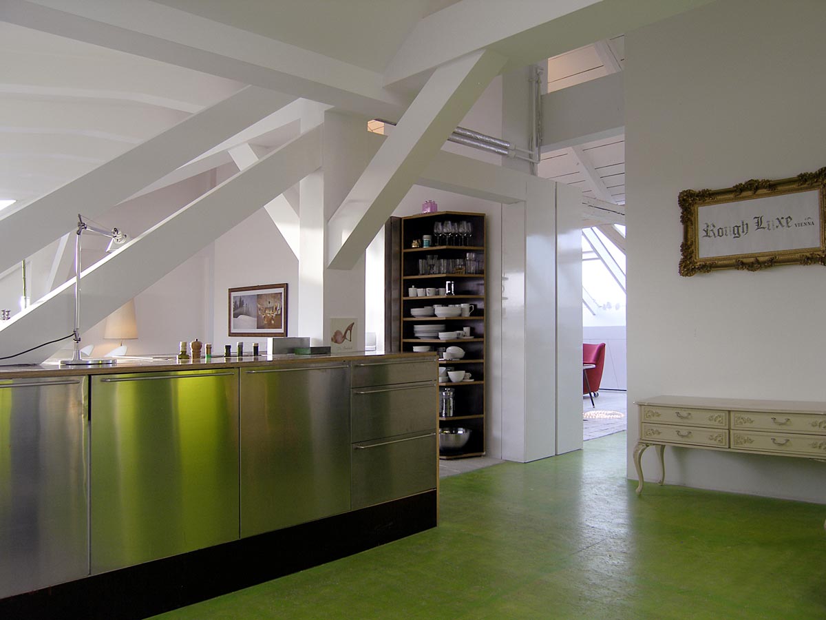 Die Aufgabe Bauphase 1 - 1997: Das Rohdachgeschoss (150 m2 Grundfläche) im 16ten Wiener Bezirk wird für eine Ateliernutzung umgebaut. Bauphase 2 - 2003: Durch Minimaleingriffe soll das Atelier zu einer Dachgeschosswohnung umfunktioniert und umgebaut werden. Der Charakter des offenen Dachraumes im „rough-luxe-style“ soll erhalten bleiben. Das Konzept / Die Ausarbeitung Leitgedanke für den Ausbau des bestehenden Rohdachgeschosses ist mit wenigen Eingriffen weitläufigen Raum zu erzeugen, sowie die bestehenden Strukturen zu erhalten und in Szene zu setzen. Durch die Aufklappung der südseitigen Dachhälfte entsteht eine Panoramaglasfront. An der nordseitigen Dachhälfte wird eine Atelierdachverglasungen eingebaut. Um die Raumproportion zu optimieren erfolgt ein kleiner Eingriff in den Giebelbereich, größtenteils folgt das Dach jedoch seinen ursprünglichen Konturen. Das Dachgebälk wird in brandschutztechnisch, notwendigen Bereichen, mit einer Trockenbauverkleidung ummantelt. Somit bleibt die Dachkonstruktion ablesbar und der Charme des Altbestandes erhalten. Der Sanitärbereich steht als solitärer grüner „CUBE“ mitten im Raum. In Bauphase 2 wird ein Kinderzimmer abgetrennt, die restliche Wohnfläche bleibt offen. Koch- Essbereich, Bad-Cube und das Elternschlafzimmer sind südorientiert, Wohn- und Arbeitsbereich und das Kinderzimmer sind nordorientiert. Der Innenraum Der offene Grundriss des Dachbodens bleibt fast unangetastet. Das Raumgefüge wird durch die Gruppe der bestehenden Kamine und das Gesperre der alten Dachstuhl- konstruktion strukturiert. Die Möblierung ordnet sich in diese Gliederung ein. Bauteil und Möbel gehen formal ineinander über. Der Sanitärbereich, der 'Green Cube' steht ähnlich eines Kunstobjektes mitten im Raum. Die Abtrennung des Kinderzimmers erfolgt durch eine Möbelwand die sich konzeptuell und formal in das Möblierungskonzept eingliedert. Farbgebung,Oberfläche und Formensprache differenzieren die alte Struktur von den neuen Ein- und Ausbauten. In Koch-, Ess- und Wohnbereich werden die ursprünglichen Brandschutzziegel wieder verlegt und mit Polyurethan wird beschichtet. Die restlichen Bodenflächen sind mit grün lackiertem Plattenmaterial belegt. Die Komposition aus Alt und Neu setzt sich auch im Möbilierungskonzept fort. Antiquarischen Sammlerstücken stehen glatte, flächenbündige Möbeleinbauten entgegen. Unter nicht nutzbaren Dachschrägen sind Stauraummöbel integriert.