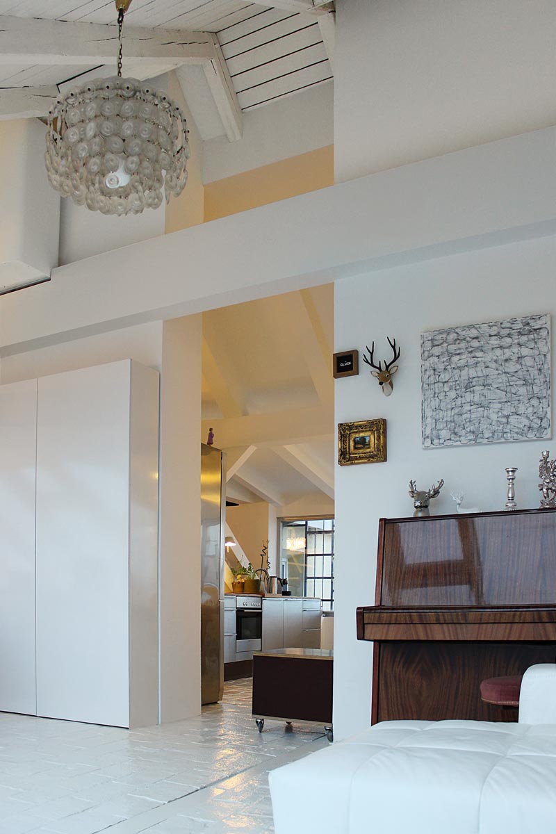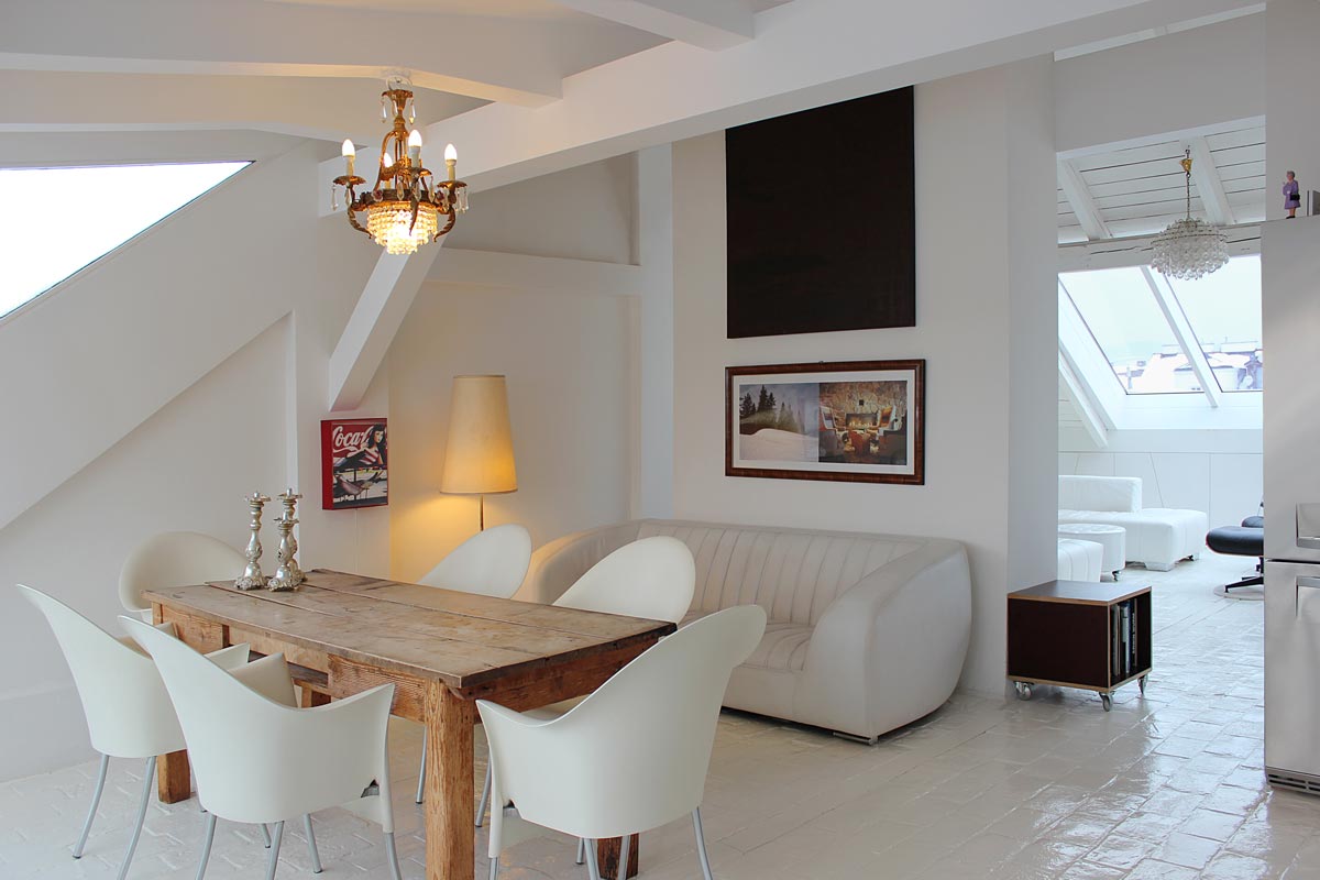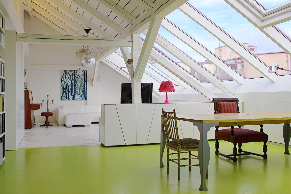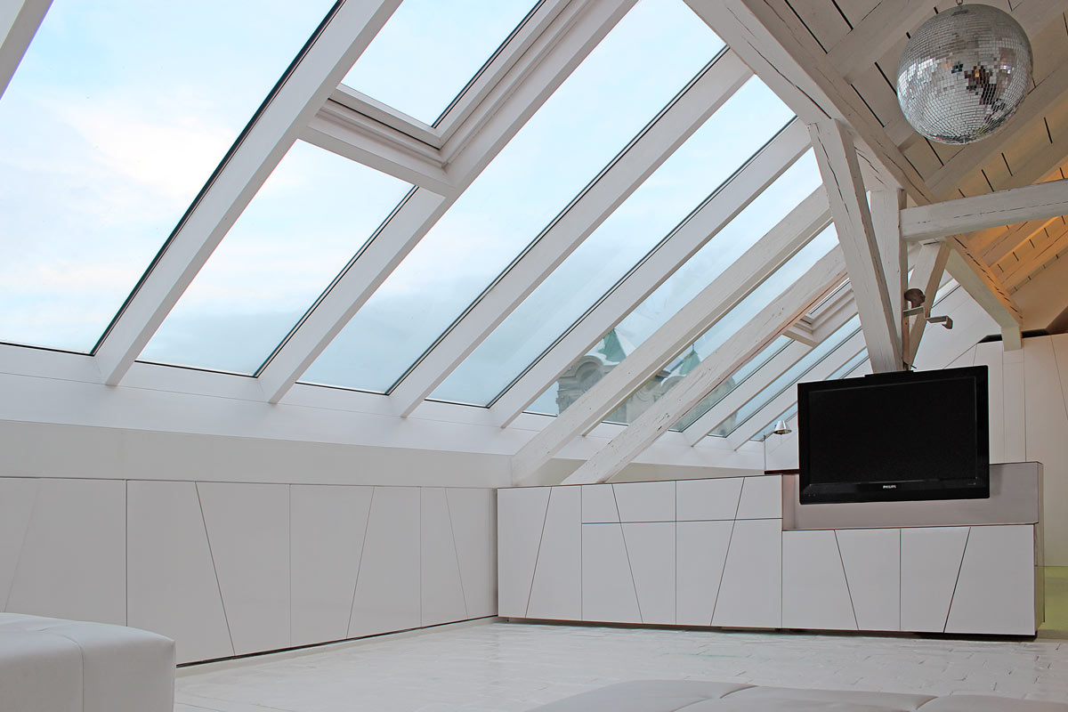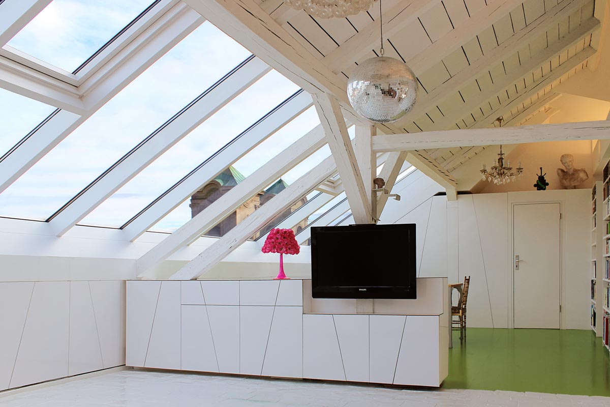 Die Aufgabe Bauphase 1 - 1997: Das Rohdachgeschoss (150 m2 Grundfläche) im 16ten Wiener Bezirk wird für eine Ateliernutzung umgebaut. Bauphase 2 - 2003: Durch Minimaleingriffe soll das Atelier zu einer Dachgeschosswohnung umfunktioniert und umgebaut werden. Der Charakter des offenen Dachraumes im „rough-luxe-style“ soll erhalten bleiben. Das Konzept / Die Ausarbeitung Leitgedanke für den Ausbau des bestehenden Rohdachgeschosses ist mit wenigen Eingriffen weitläufigen Raum zu erzeugen, sowie die bestehenden Strukturen zu erhalten und in Szene zu setzen. Durch die Aufklappung der südseitigen Dachhälfte entsteht eine Panoramaglasfront. An der nordseitigen Dachhälfte wird eine Atelierdachverglasungen eingebaut. Um die Raumproportion zu optimieren erfolgt ein kleiner Eingriff in den Giebelbereich, größtenteils folgt das Dach jedoch seinen ursprünglichen Konturen. Das Dachgebälk wird in brandschutztechnisch, notwendigen Bereichen, mit einer Trockenbauverkleidung ummantelt. Somit bleibt die Dachkonstruktion ablesbar und der Charme des Altbestandes erhalten. Der Sanitärbereich steht als solitärer grüner „CUBE“ mitten im Raum. In Bauphase 2 wird ein Kinderzimmer abgetrennt, die restliche Wohnfläche bleibt offen. Koch- Essbereich, Bad-Cube und das Elternschlafzimmer sind südorientiert, Wohn- und Arbeitsbereich und das Kinderzimmer sind nordorientiert. Der Innenraum Der offene Grundriss des Dachbodens bleibt fast unangetastet. Das Raumgefüge wird durch die Gruppe der bestehenden Kamine und das Gesperre der alten Dachstuhl- konstruktion strukturiert. Die Möblierung ordnet sich in diese Gliederung ein. Bauteil und Möbel gehen formal ineinander über. Der Sanitärbereich, der 'Green Cube' steht ähnlich eines Kunstobjektes mitten im Raum. Die Abtrennung des Kinderzimmers erfolgt durch eine Möbelwand die sich konzeptuell und formal in das Möblierungskonzept eingliedert. Farbgebung,Oberfläche und Formensprache differenzieren die alte Struktur von den neuen Ein- und Ausbauten. In Koch-, Ess- und Wohnbereich werden die ursprünglichen Brandschutzziegel wieder verlegt und mit Polyurethan wird beschichtet. Die restlichen Bodenflächen sind mit grün lackiertem Plattenmaterial belegt. Die Komposition aus Alt und Neu setzt sich auch im Möbilierungskonzept fort. Antiquarischen Sammlerstücken stehen glatte, flächenbündige Möbeleinbauten entgegen. Unter nicht nutzbaren Dachschrägen sind Stauraummöbel integriert.