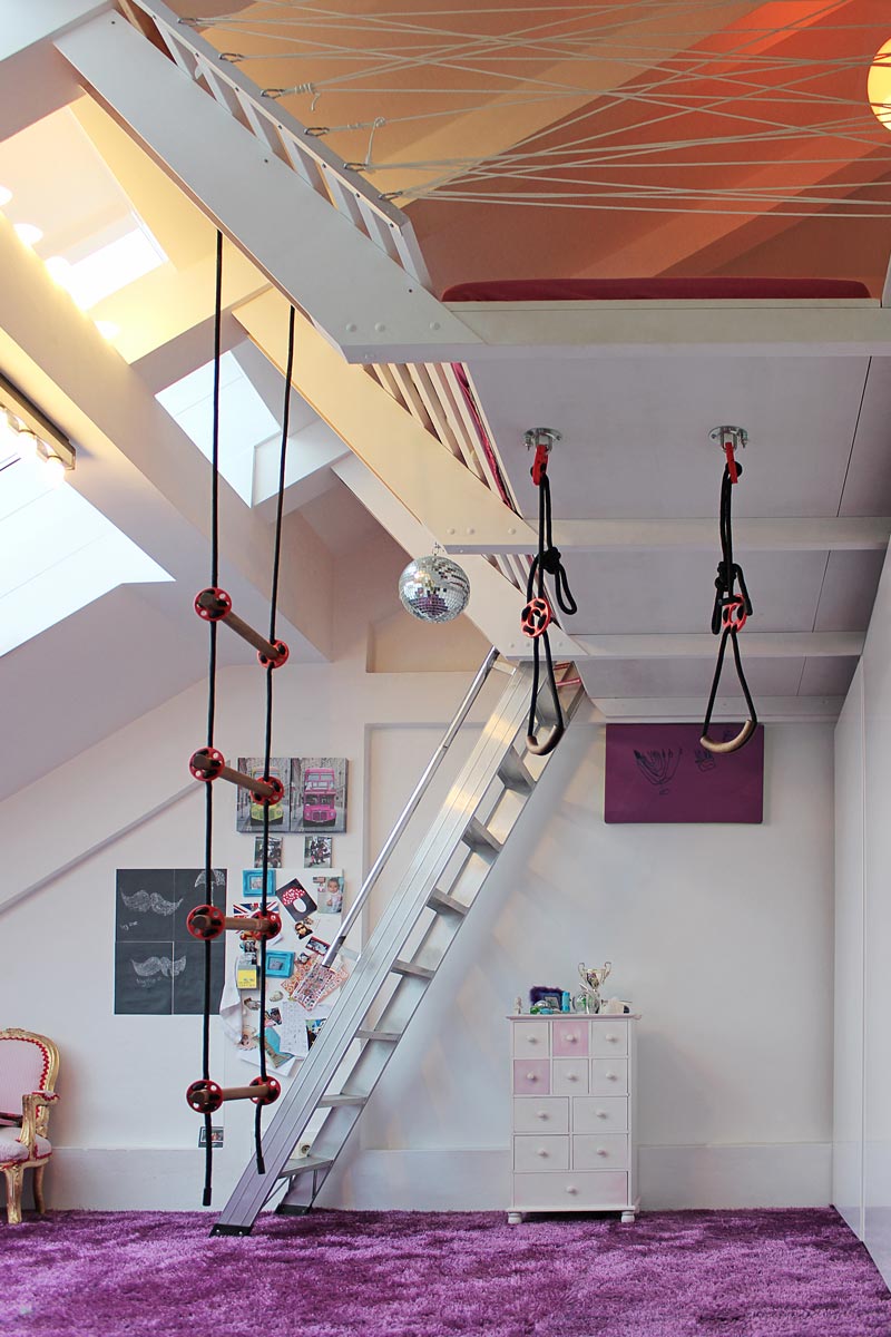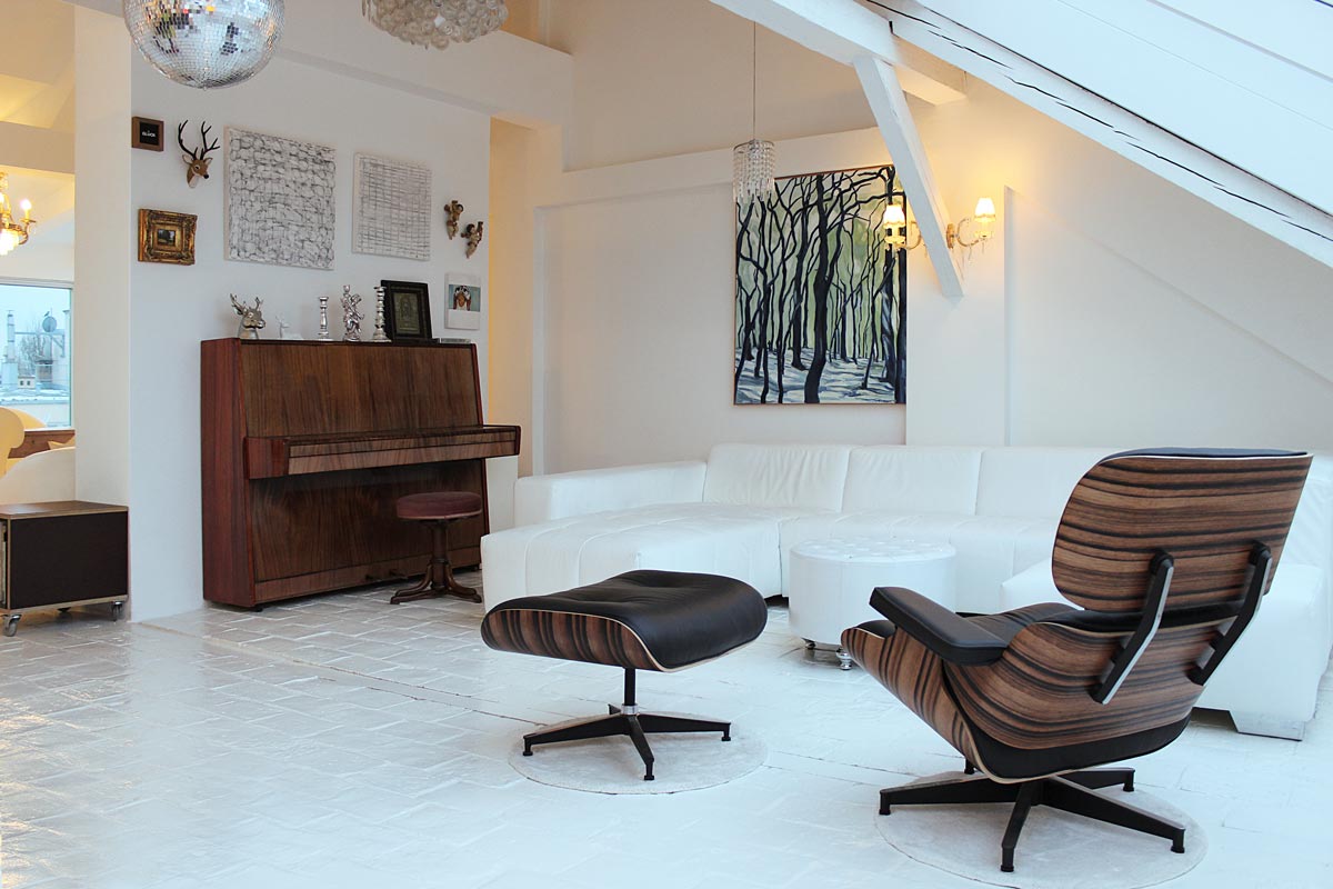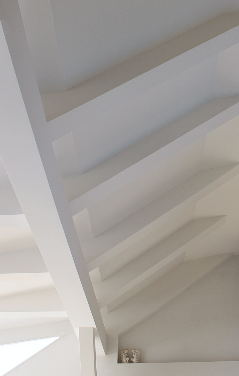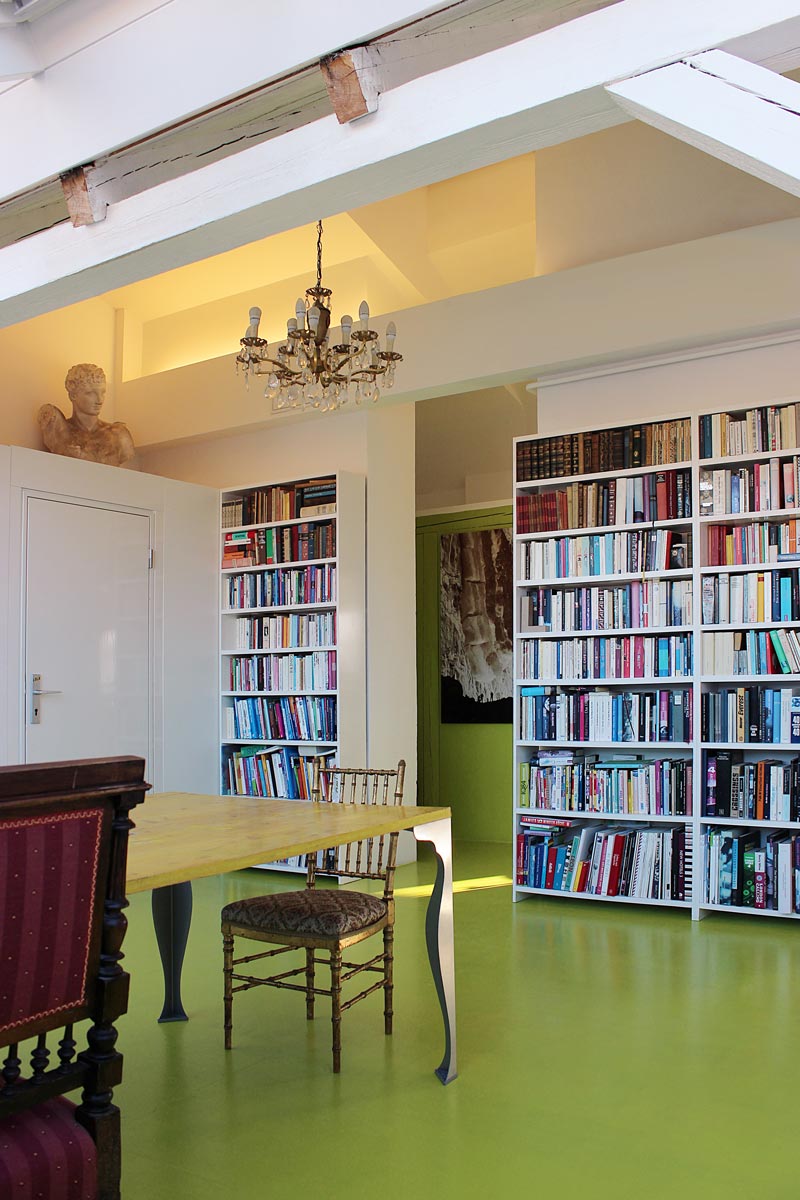 Die Aufgabe Bauphase 1 - 1997: Das Rohdachgeschoss (150 m2 Grundfläche) im 16ten Wiener Bezirk wird für eine Ateliernutzung umgebaut. Bauphase 2 - 2003: Durch Minimaleingriffe soll das Atelier zu einer Dachgeschosswohnung umfunktioniert und umgebaut werden. Der Charakter des offenen Dachraumes im „rough-luxe-style“ soll erhalten bleiben. Das Konzept / Die Ausarbeitung Leitgedanke für den Ausbau des bestehenden Rohdachgeschosses ist mit wenigen Eingriffen weitläufigen Raum zu erzeugen, sowie die bestehenden Strukturen zu erhalten und in Szene zu setzen. Durch die Aufklappung der südseitigen Dachhälfte entsteht eine Panoramaglasfront. An der nordseitigen Dachhälfte wird eine Atelierdachverglasungen eingebaut. Um die Raumproportion zu optimieren erfolgt ein kleiner Eingriff in den Giebelbereich, größtenteils folgt das Dach jedoch seinen ursprünglichen Konturen. Das Dachgebälk wird in brandschutztechnisch, notwendigen Bereichen, mit einer Trockenbauverkleidung ummantelt. Somit bleibt die Dachkonstruktion ablesbar und der Charme des Altbestandes erhalten. Der Sanitärbereich steht als solitärer grüner „CUBE“ mitten im Raum. In Bauphase 2 wird ein Kinderzimmer abgetrennt, die restliche Wohnfläche bleibt offen. Koch- Essbereich, Bad-Cube und das Elternschlafzimmer sind südorientiert, Wohn- und Arbeitsbereich und das Kinderzimmer sind nordorientiert. Der Innenraum Der offene Grundriss des Dachbodens bleibt fast unangetastet. Das Raumgefüge wird durch die Gruppe der bestehenden Kamine und das Gesperre der alten Dachstuhl- konstruktion strukturiert. Die Möblierung ordnet sich in diese Gliederung ein. Bauteil und Möbel gehen formal ineinander über. Der Sanitärbereich, der 'Green Cube' steht ähnlich eines Kunstobjektes mitten im Raum. Die Abtrennung des Kinderzimmers erfolgt durch eine Möbelwand die sich konzeptuell und formal in das Möblierungskonzept eingliedert. Farbgebung,Oberfläche und Formensprache differenzieren die alte Struktur von den neuen Ein- und Ausbauten. In Koch-, Ess- und Wohnbereich werden die ursprünglichen Brandschutzziegel wieder verlegt und mit Polyurethan wird beschichtet. Die restlichen Bodenflächen sind mit grün lackiertem Plattenmaterial belegt. Die Komposition aus Alt und Neu setzt sich auch im Möbilierungskonzept fort. Antiquarischen Sammlerstücken stehen glatte, flächenbündige Möbeleinbauten entgegen. Unter nicht nutzbaren Dachschrägen sind Stauraummöbel integriert.