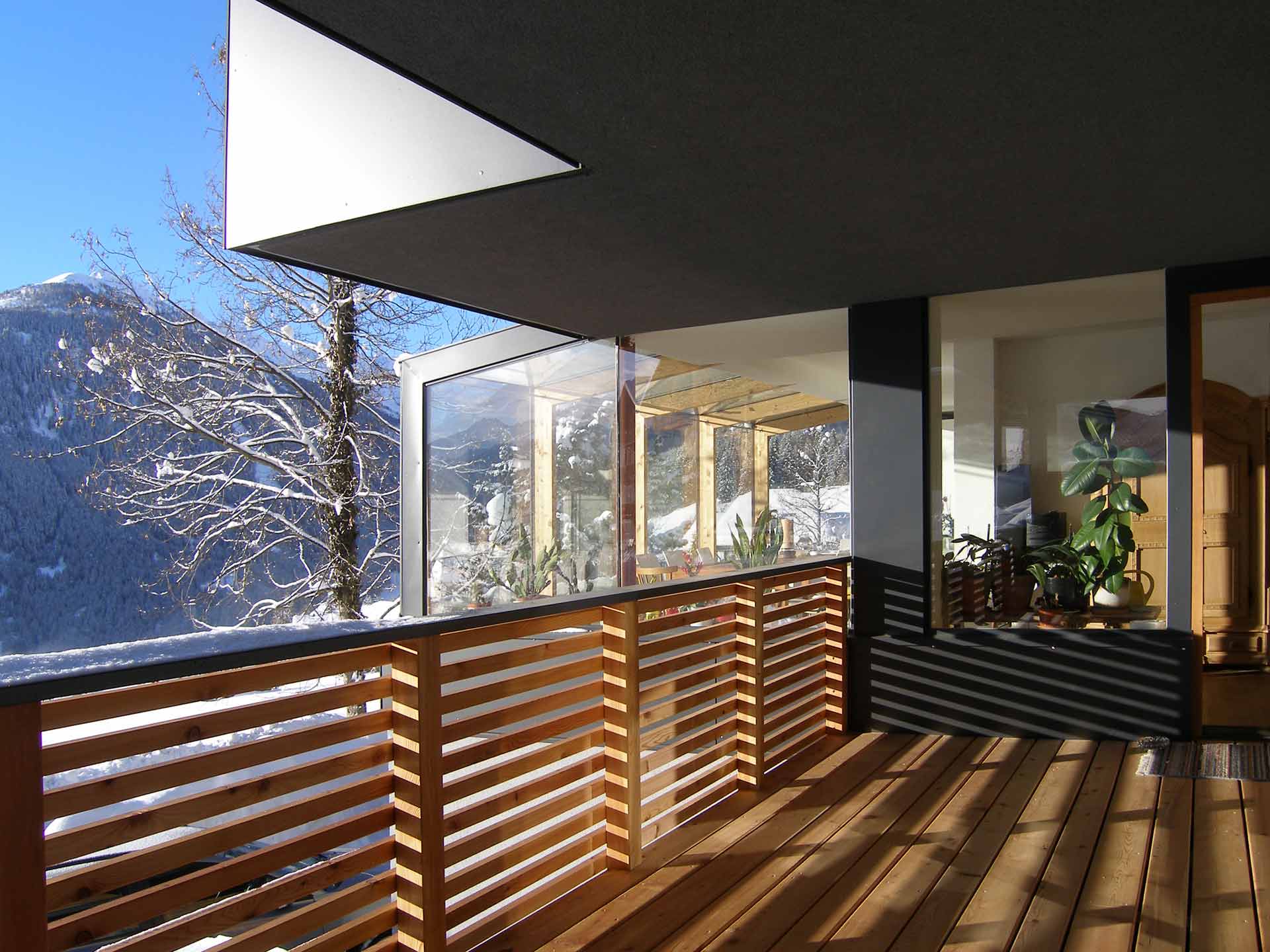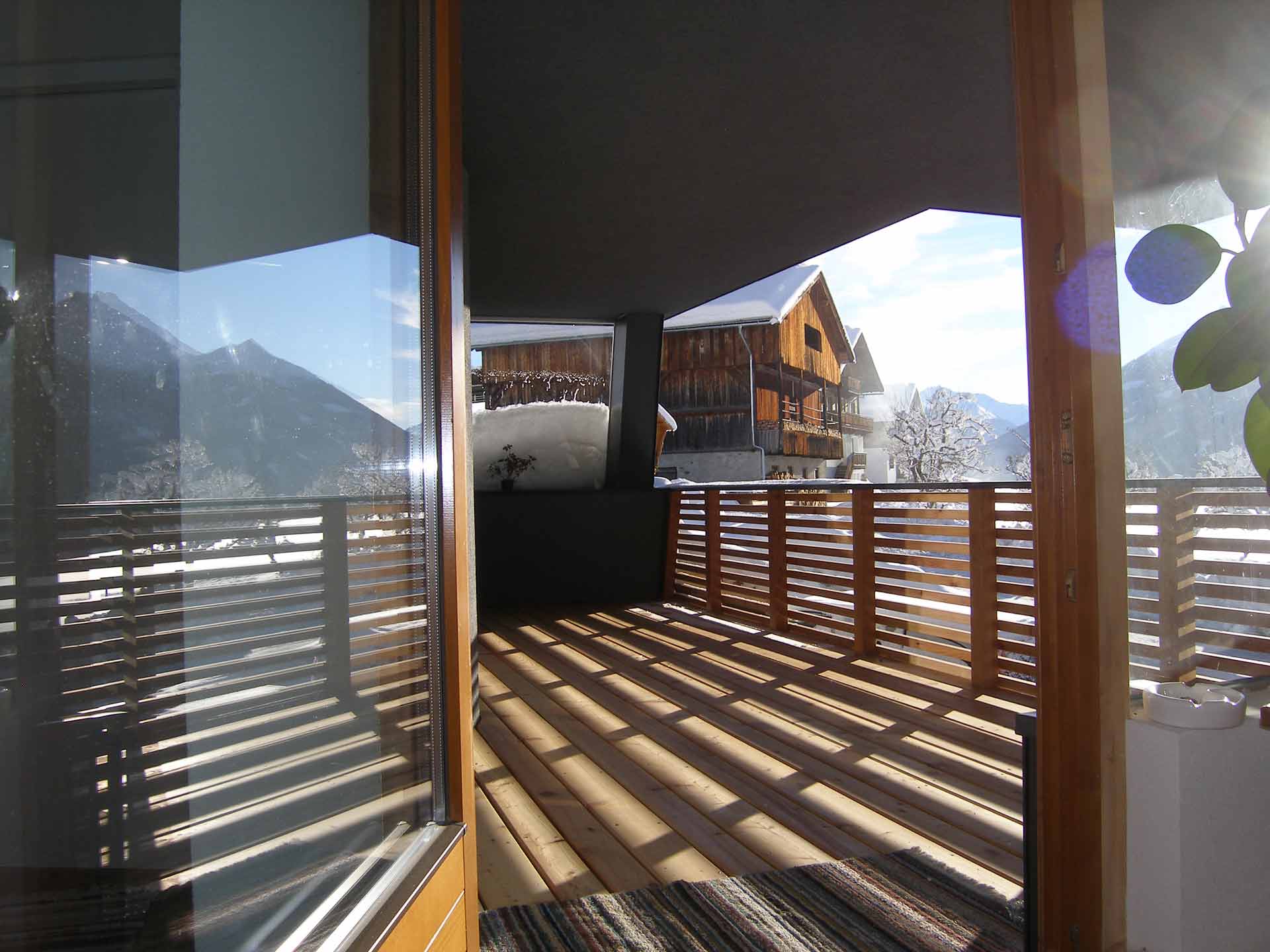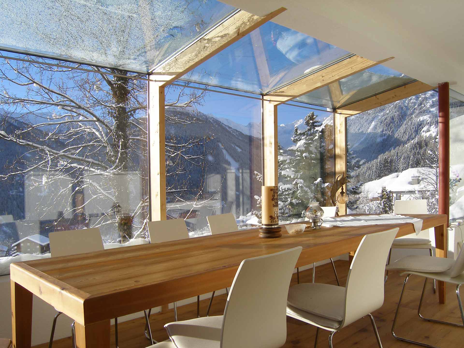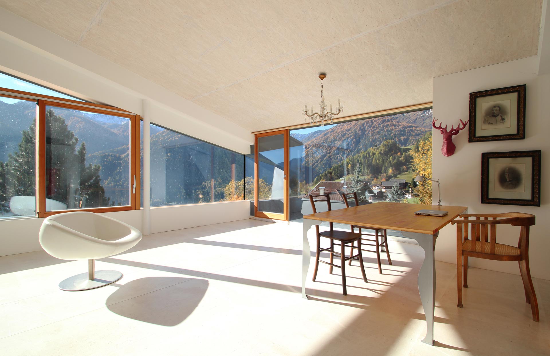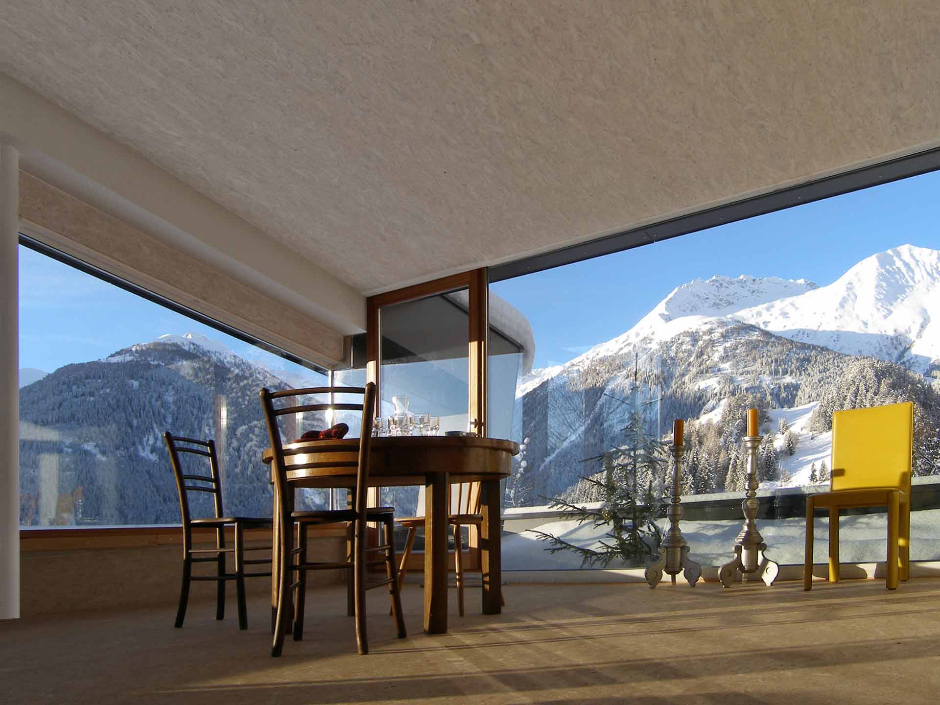 // Große Glasflächen öffnen die Wohnungen und holen das Parmorama der umliegenden Berge ins Innere.