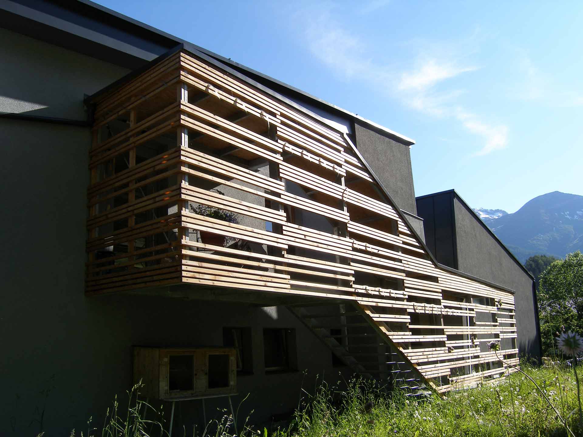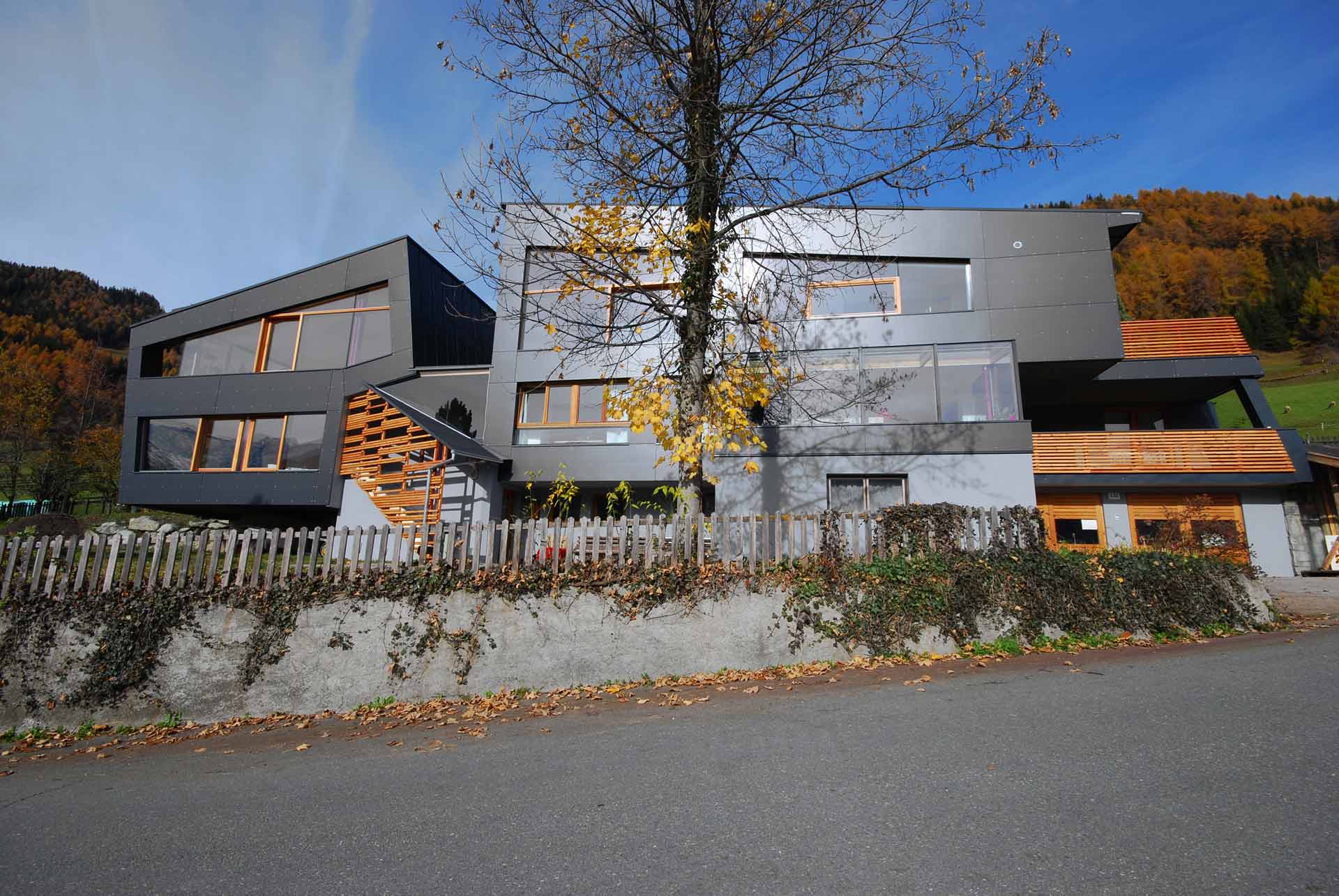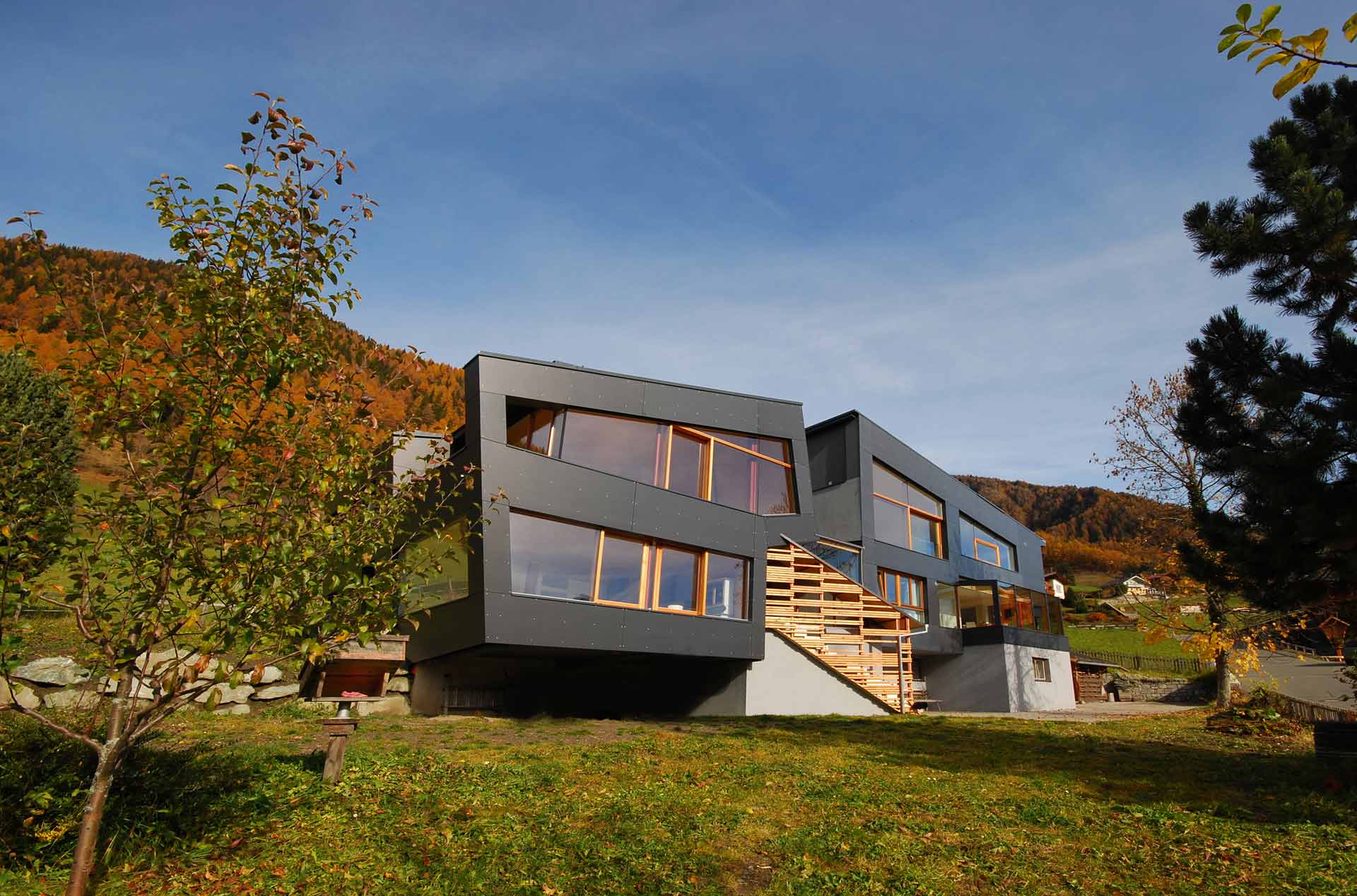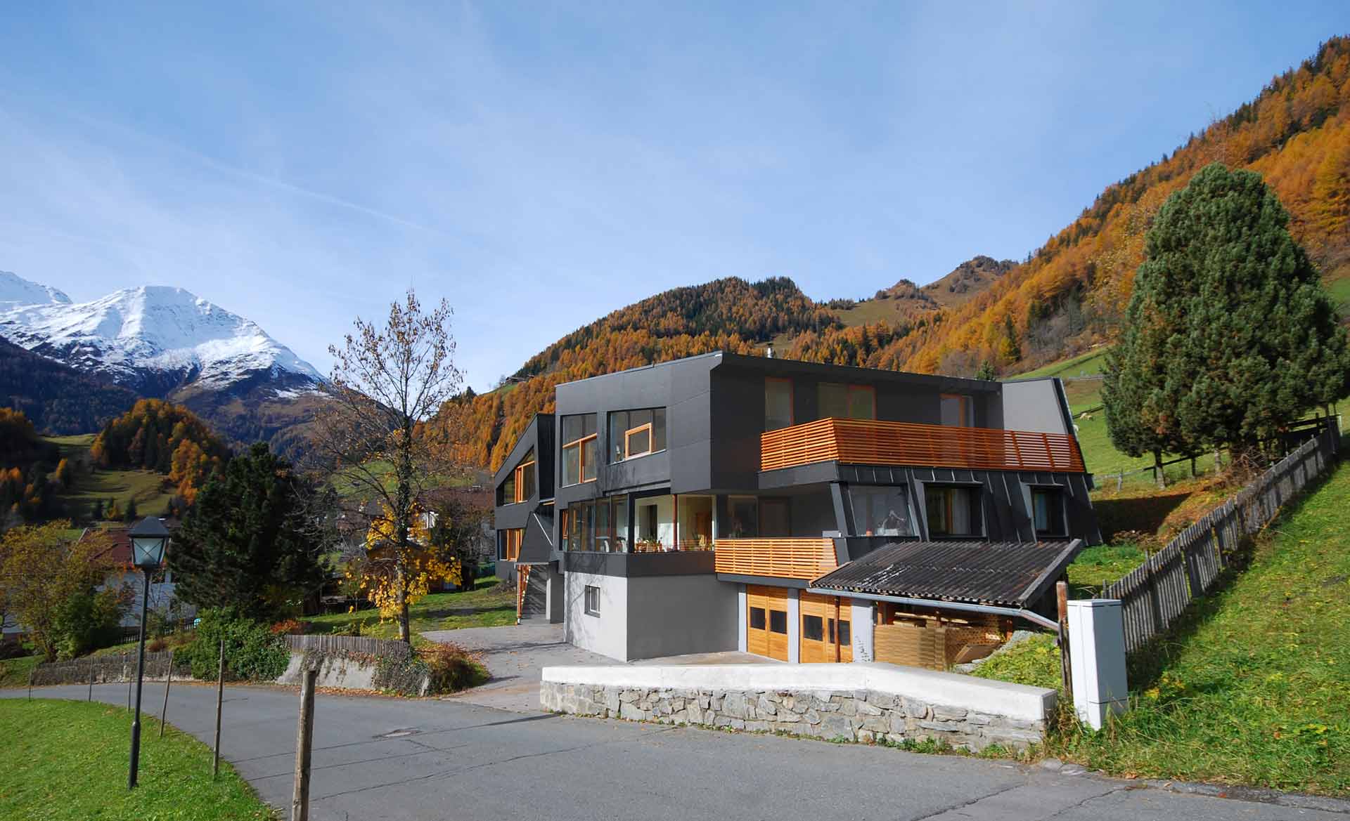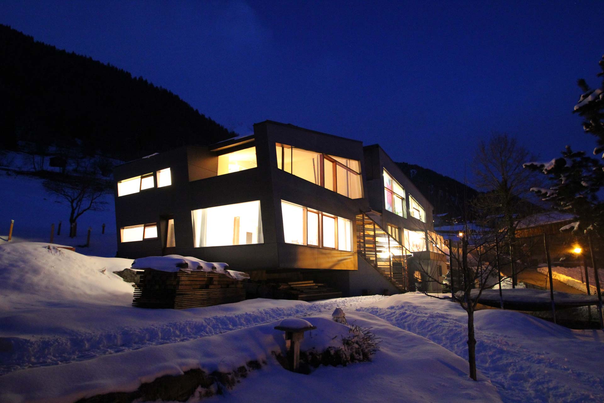 // Große Glasflächen öffnen die Wohnungen und holen das Parmorama der umliegenden Berge ins Innere.