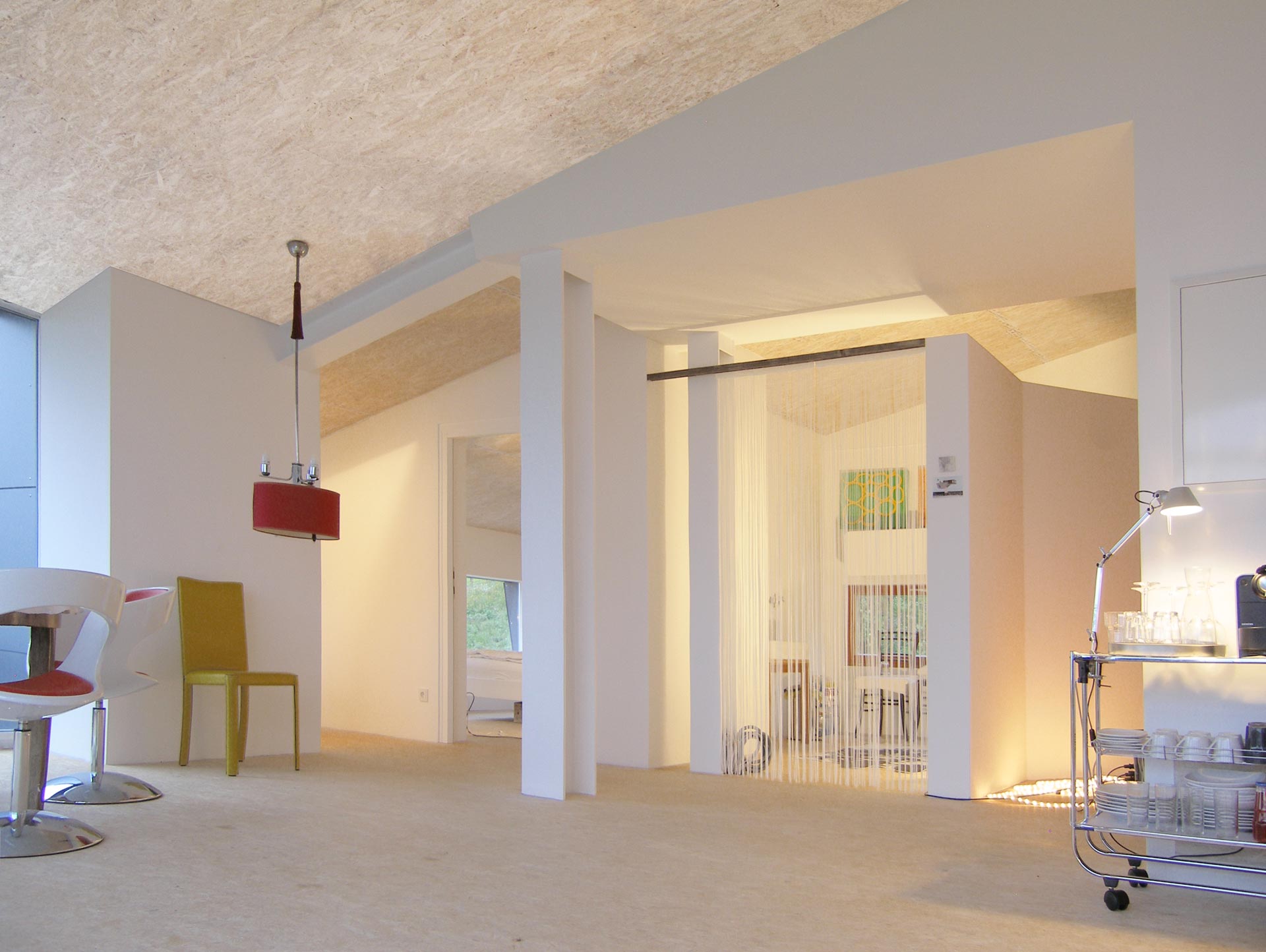 // Die Innenräume sind als offene Grundrisse konzipiert. Räumliche Abtrennungen sind auf ein Minimum reduziert.