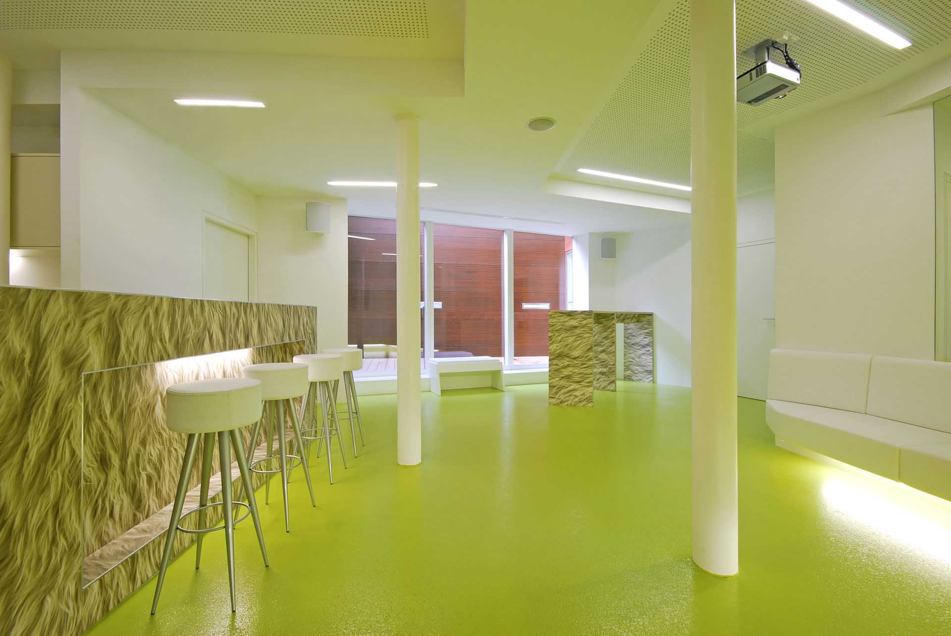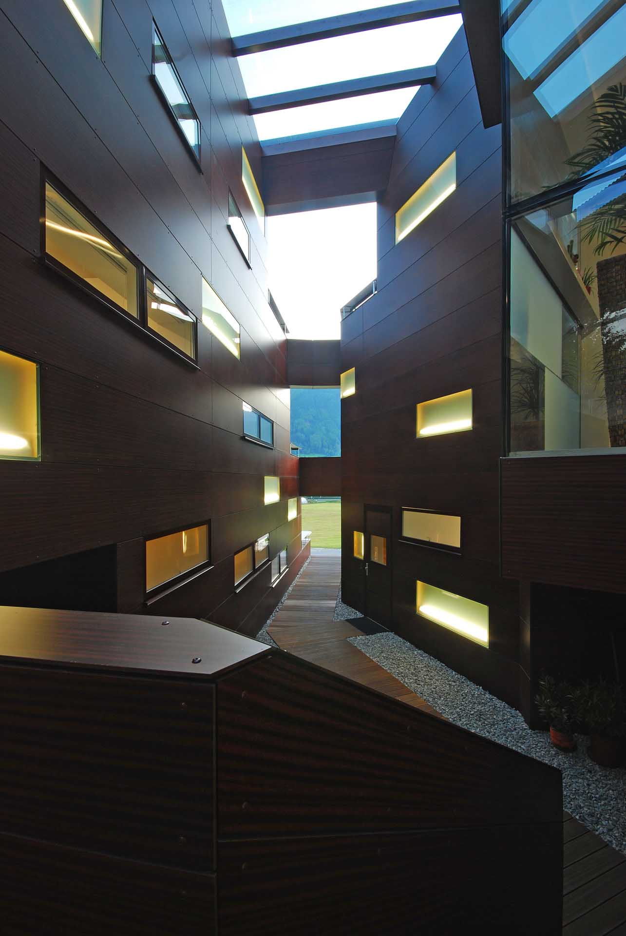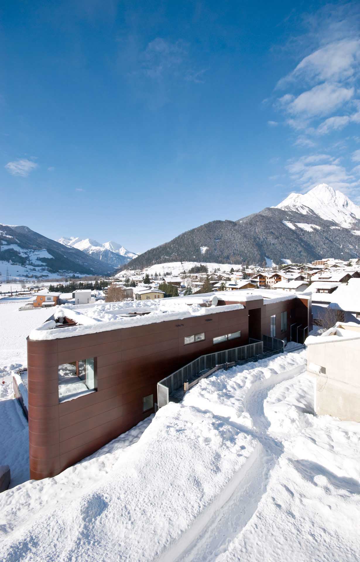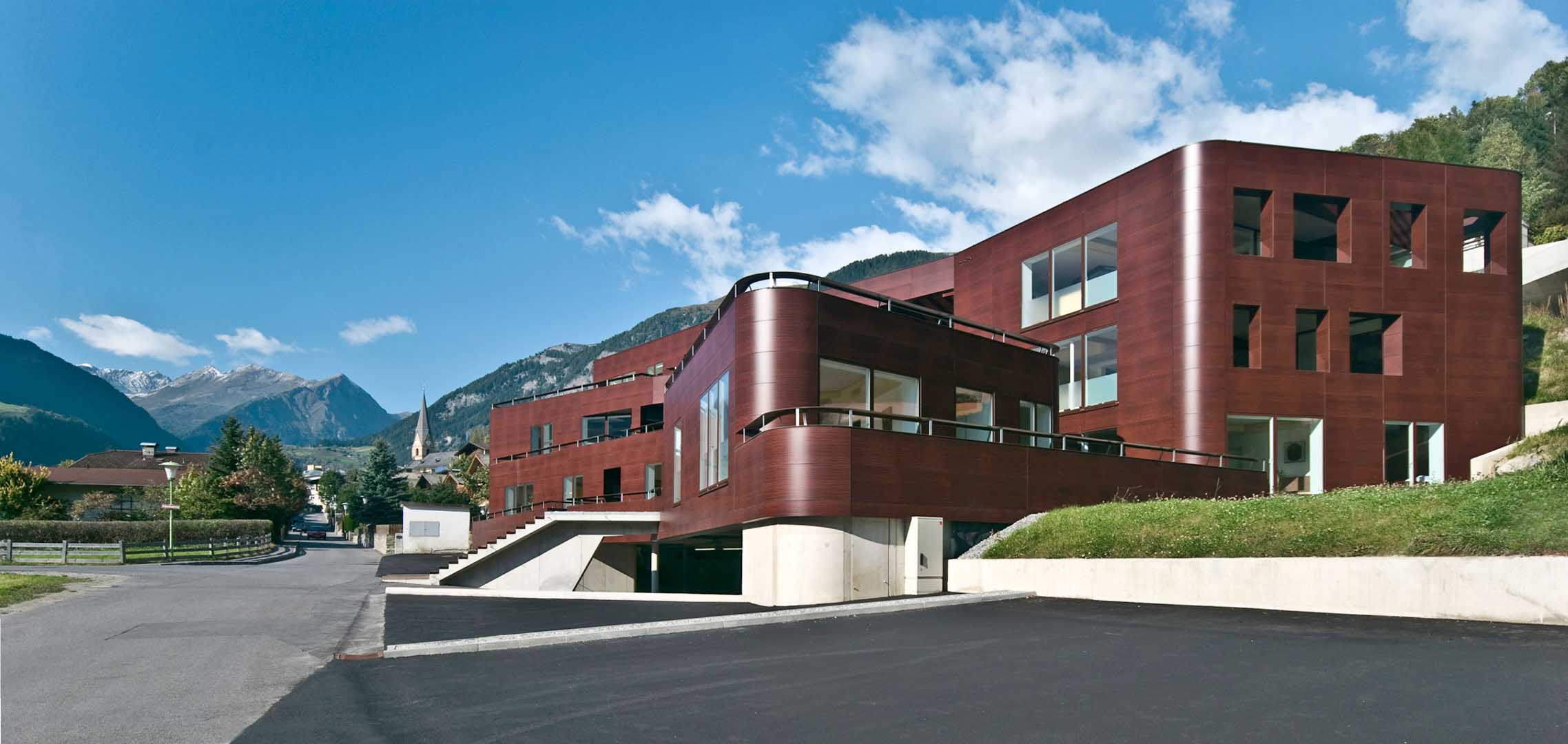 s u n resultiert in Form, Organisation, Erscheinungsbild und Orientierung aus den spezifischen Gegebenheiten des Ortes, wobei sich die Appartementanlage als kraftvolles Statement innerhalb der traditionellen und homogen kleinteiligen Bebauungsstruktur Matreis zeigen soll. Das schmale, sehr steile L-förmige Hanggrundstück, diente nicht nur als Ausgangslage, sondern zugleich als konzeptioneller und struktureller Impetus. Dem zu Folge zeigt sich s u n als terrassierter viergeschossiger Gebäudekomplex, der die weit gefächerten Höhenlinien des Geländes inkorporiert und damit auch den Höhenversprung von 25 Metern nachvollzieht. Über dem - gegenüber der am Hangfuß verlaufenden Straße - um 75 cm abgesenkten Untergeschoss (Funktion: sun-office, sun-lounge mit Veranstaltungsräumen) staffeln sich drei Wohngeschosse mit insgesamt neun Wohnungen (sun-appartements), die so flexibel konzipiert wurden, dass sich je nach Bedarf Appartements zu unterschiedlich großen Einheiten kombinieren lassen und die Verwendung hinsichtlich Verkauf, Vermietung oder kurzfristiger Nutzung im Boardinghouse Charakter entsprechend der individuellen Anforderungen und spezifischen Nutzerprofile vorgenommen werden kann. Durch die terrassierte Konfiguration des Gebäudes konnten den Wohnungen auf allen Ebenen natürliche Freibereiche zugeordnet werden, alle Einheiten weisen hochwertige Außenzonen mit Balkonen oder Loggien auf. Das interne Erschließungssystem von s u n geht über den rein funktionalen Anspruch hinaus: der Weg wird Ort - innen liegende Piazzas und Lichthöfe weiten den Blick, bieten Aufenthaltsqualität und verknüpfen unterschiedliche Zonen unterschiedlicher Nutzungsbestimmungen. Der Bewegungsfluss innerhalb des Gebäudes über Lifte, Stiegen, Rampen, Stege und Gänge , die terrassierten Freibereiche und eben jene Raumerweiterungen transformieren die topographische Besonderheit des Grundstücks, machen diese für den Bewohner erleb - und nachvollziehbar. Zugleich orientiert sich das interne Wegesystem an der natürlichen Lichtführung. Im Laufe des Tages vollzieht sich in Abhängigkeit vom Sonnenstand im Inneren des Gebäudes ein differenziertes und expressives Spiel verschiedener Lichtszenarien und lichtdurchfluteter Bereiche. Für die Außenhaut wurde eine Fassadenverkleidung aus FunderMax-Platten gewählt, deren rötlich braune Holzoptik das lokale Erscheinungsbild traditioneller Tiroler Holzbauten zitiert, aber neu interpretiert. Auf diese Weise soll das Gebäude in spannungsvollen Dialog mit der Umgebung treten, ohne sich dieser anzubiedern. Planungsbeginn: 2004 Baubeginn: 2006 Fertigstellung: 2008 Bautypus: Apartmentanlage / Wohnbau Wohneinheiten: 9 Büro: 1 Grundstücksfläche: 1.400 m² Nutzfläche: 1.275 m² Freifläche: (Terrassen) 570 m²
