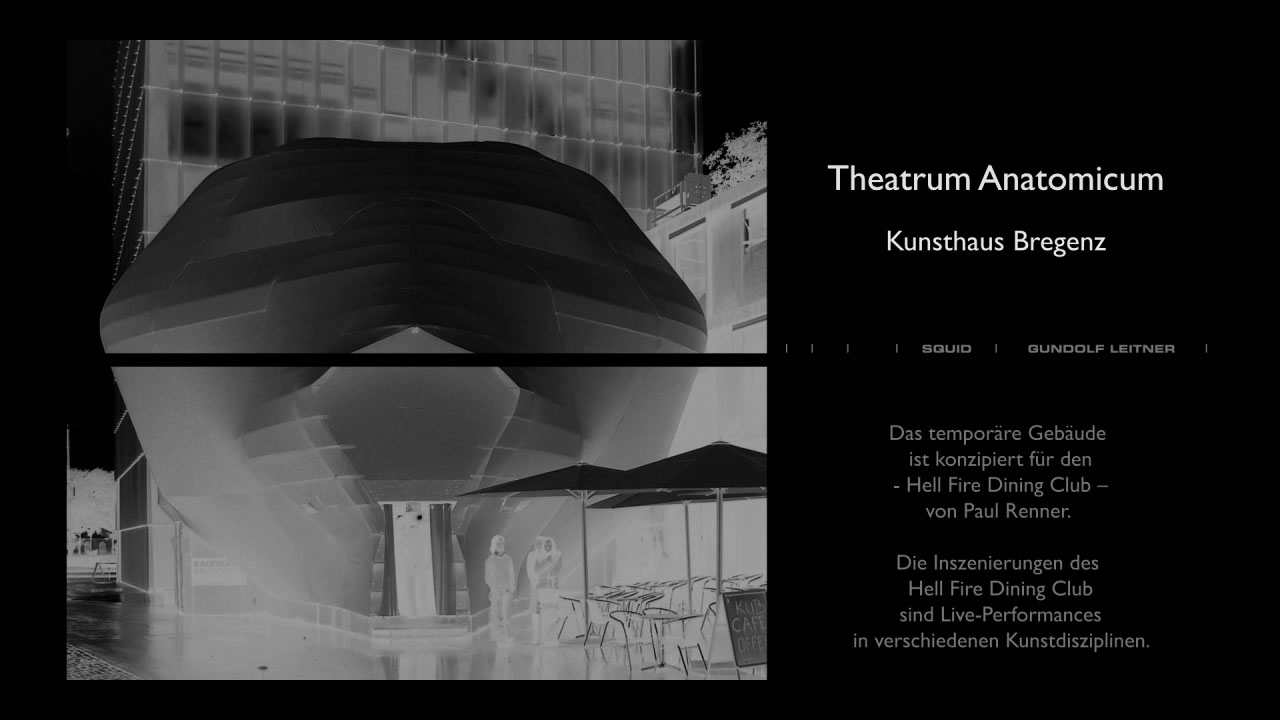 Das »Theatrum Anatomicum« vor dem Kunsthaus Bregenz hatte im Rahmen der 10 Jahresfeier des Kunsthaus Bregenz für die von Paul Renner initiierten Live-Performances seine Pforten geöffnet. Vor Publikum werden dort Speisefolgen experimentell arbeitender Küchenchefs zelebriert. Der von Paul Renner gegründete „Hellfire Dining Club“ inszeniert hier erstmals in einem eigens dafür konzipiertem Gebäude.