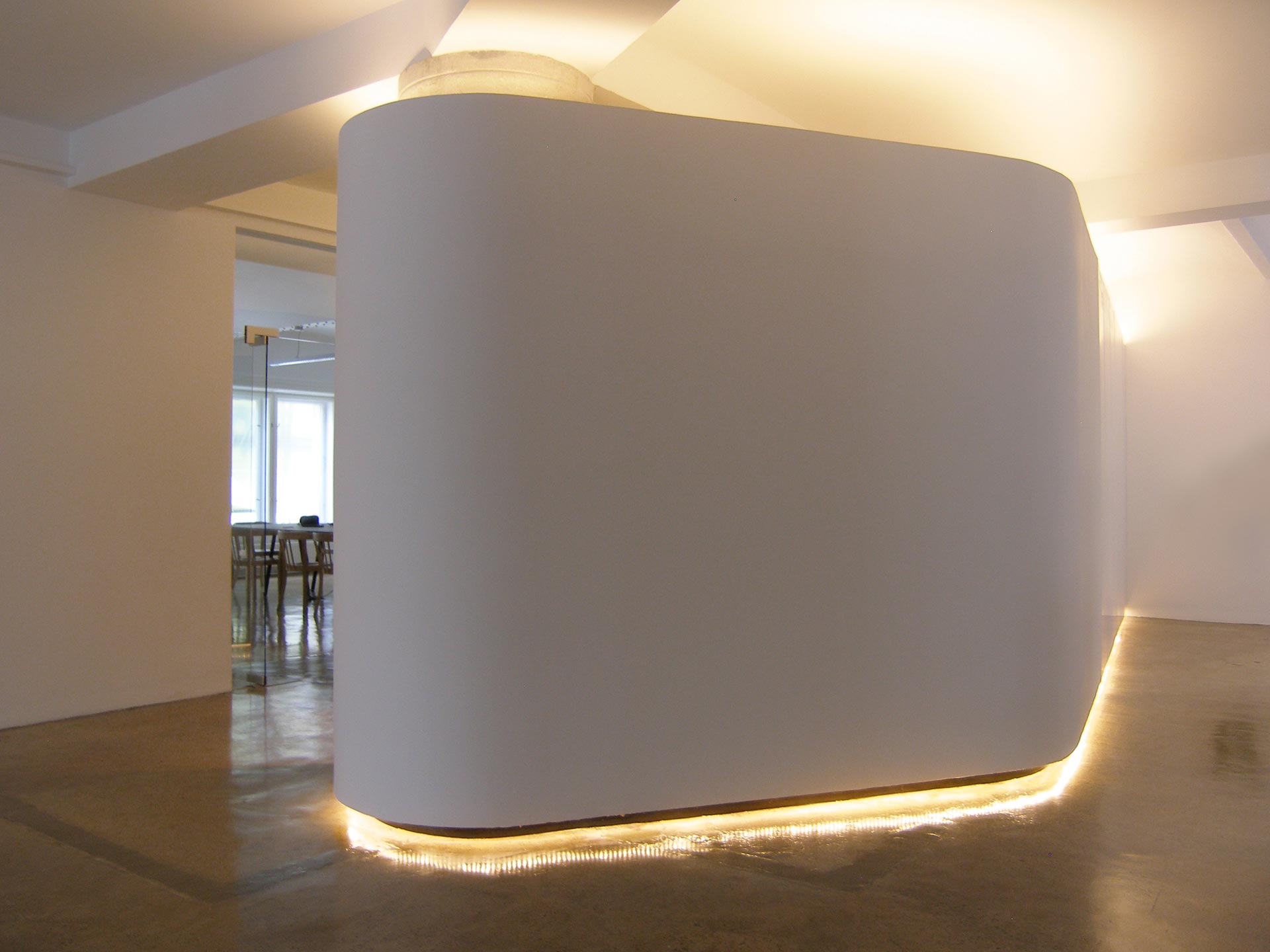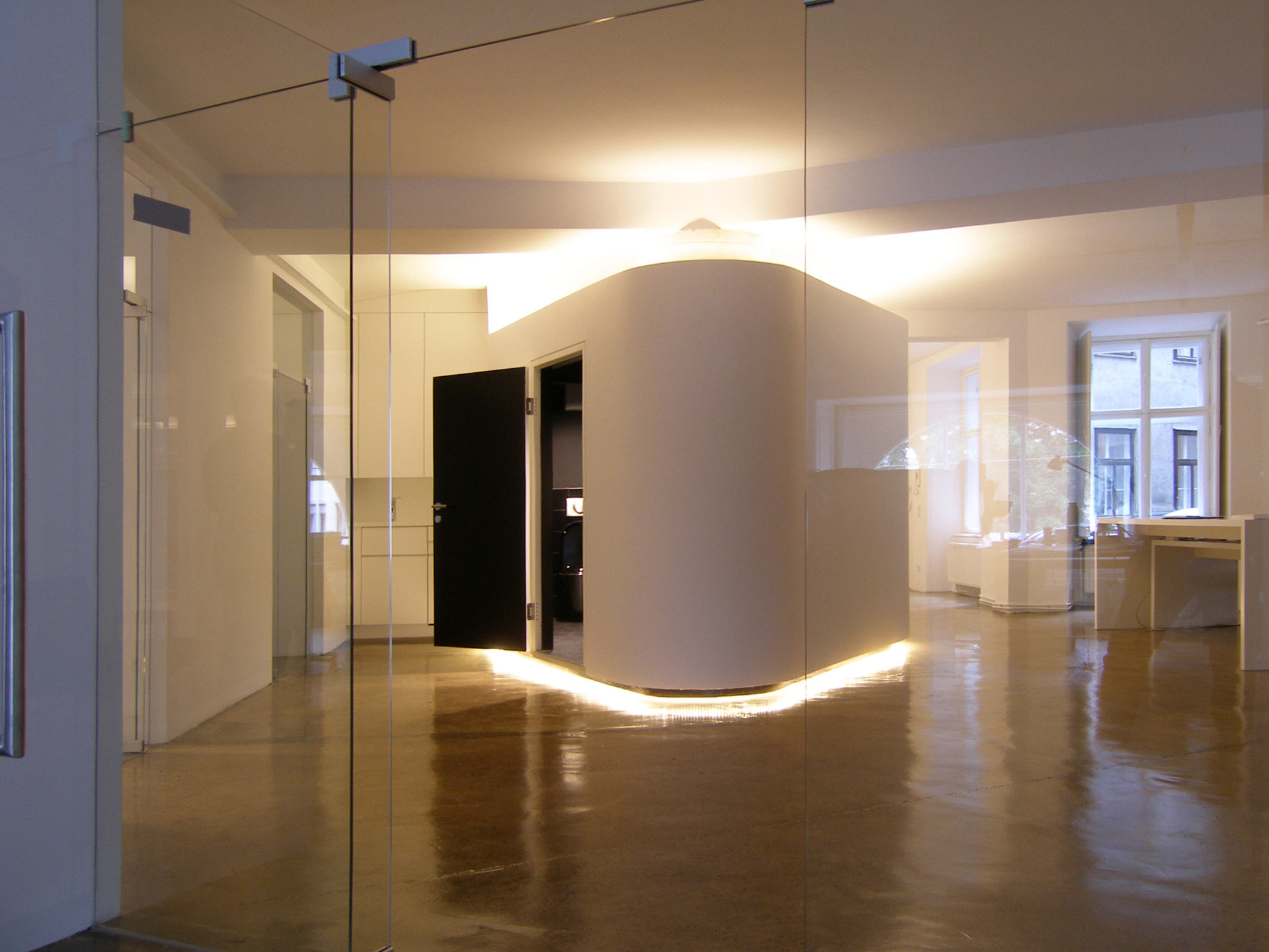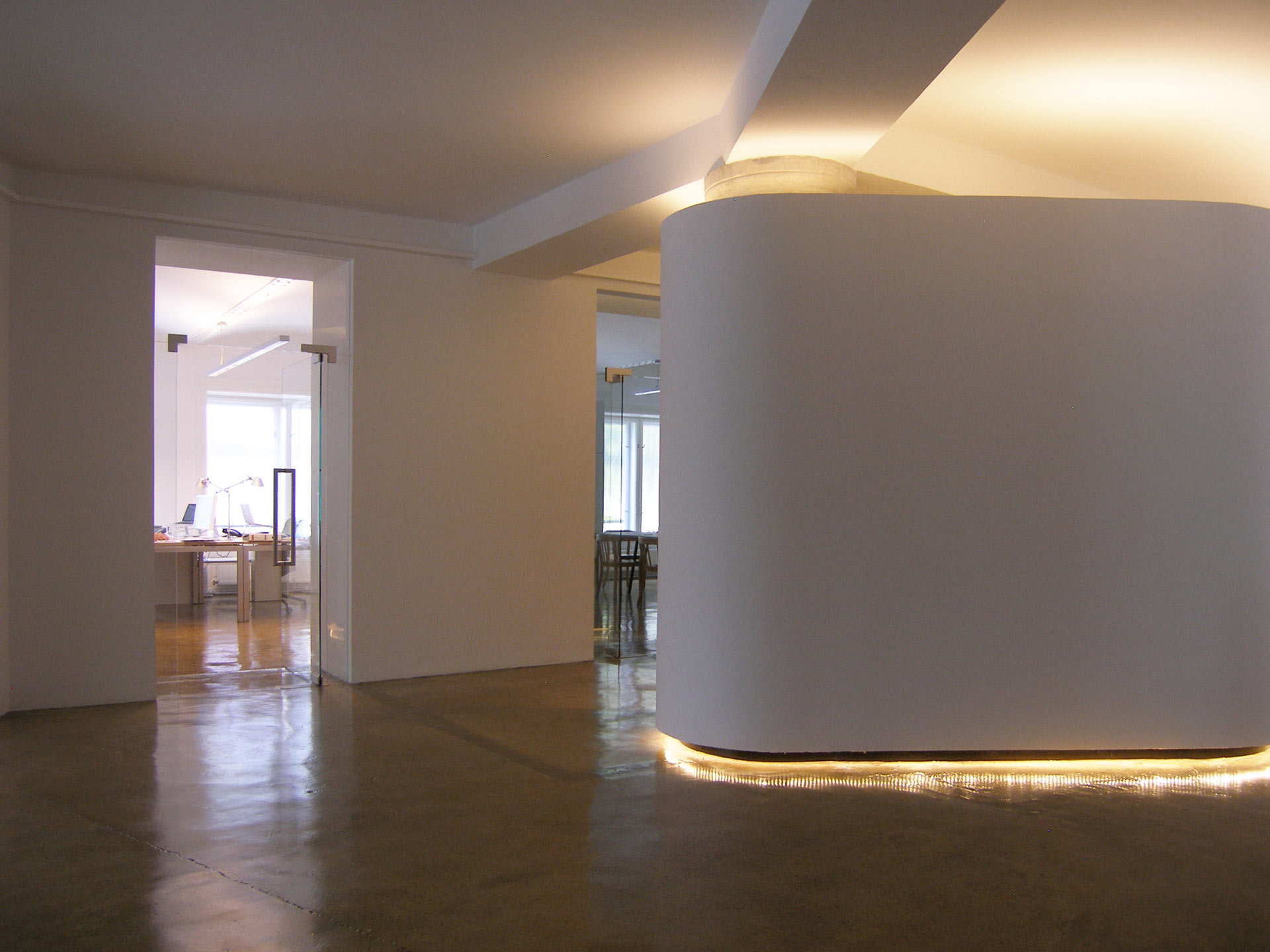 // Raumskulptur als Projektherzstück / Garderobe, WC, Teeküche integriert / Die 'softedge' Formensprache der Skulptur steht im Gegensatz zur 'hardedge' Sprache der orthogonalen Räumen / // Spannungsfeld Bestand und Neubau / // indirekte Decken- und Fußbodenbeleuchtung lassen die Skulptur im Raum schweben / // "Außenschale" / Raum+Skulptur ist weiß // . "Innenschale" graphit-schwarz /. nothing else / // Holzfaserbetonboden aus dem Jahr 1882 wurde restauriert / transparent oberflächenversiegelt / New York – Loftstyle / #newyorkloftstyle