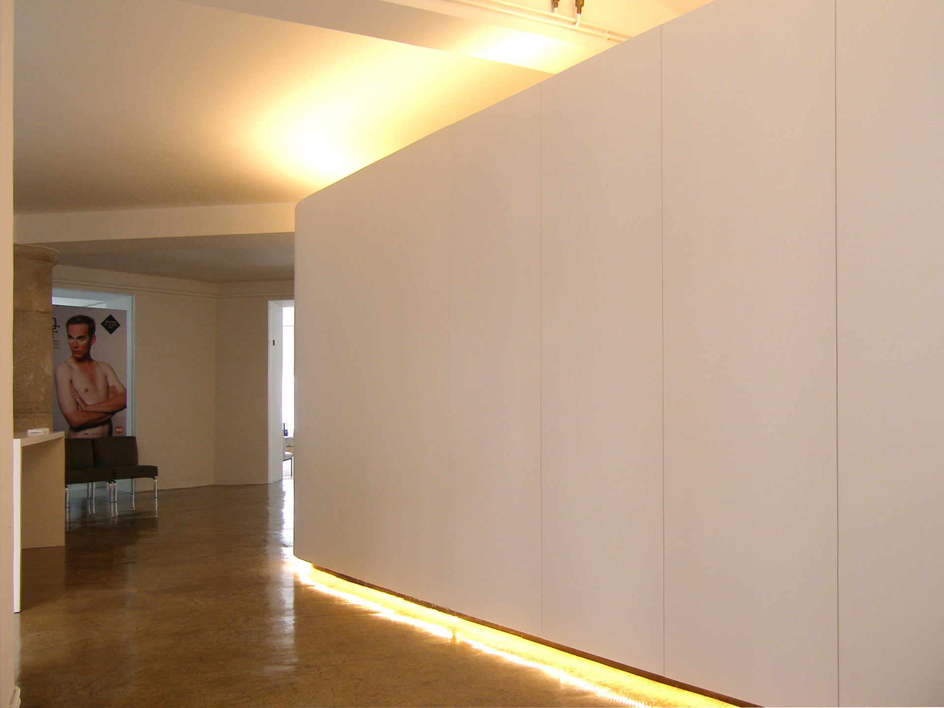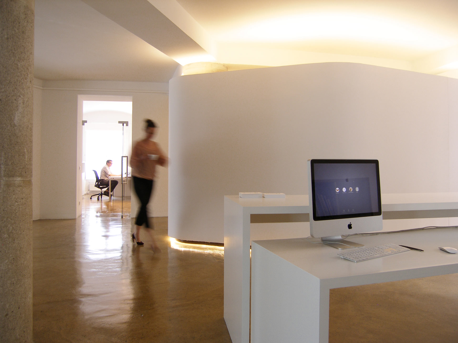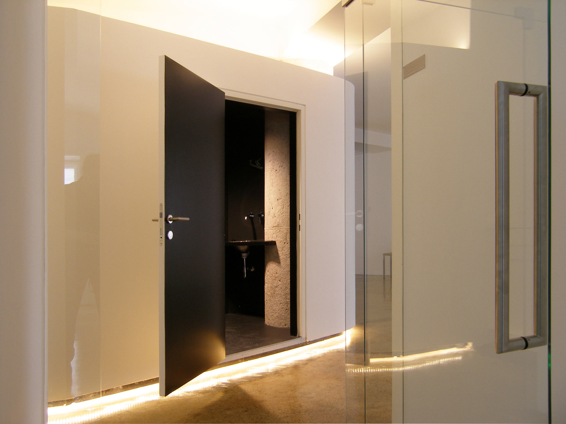// Raumskulptur als Projektherzstück / Garderobe, WC, Teeküche integriert / Die 'softedge' Formensprache der Skulptur steht im Gegensatz zur 'hardedge' Sprache der orthogonalen Räumen / // Spannungsfeld Bestand und Neubau / // indirekte Decken- und Fußbodenbeleuchtung lassen die Skulptur im Raum schweben / // "Außenschale" / Raum+Skulptur ist weiß // . "Innenschale" graphit-schwarz /. nothing else / // Holzfaserbetonboden aus dem Jahr 1882 wurde restauriert / transparent oberflächenversiegelt / New York – Loftstyle / #newyorkloftstyle