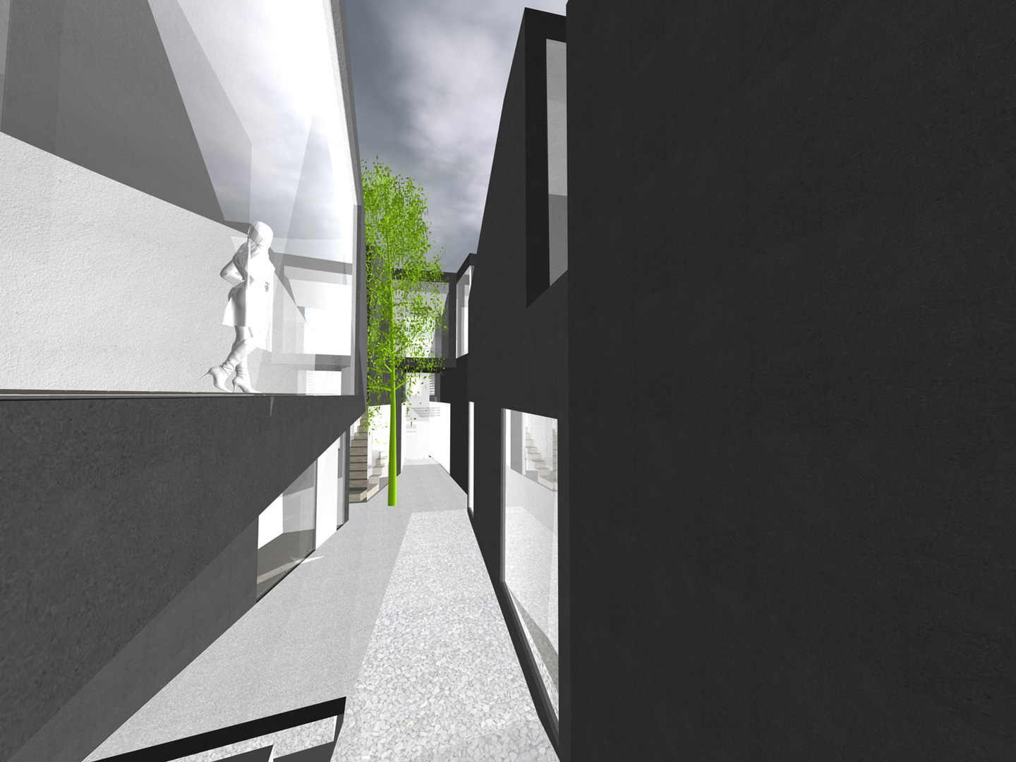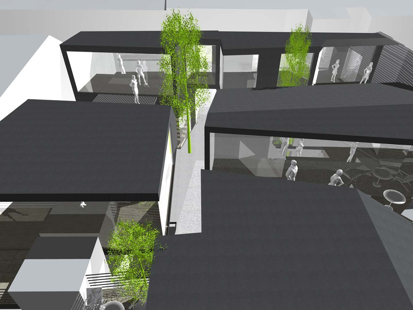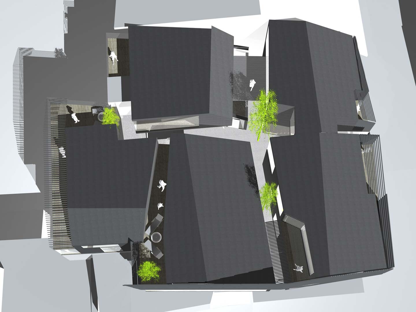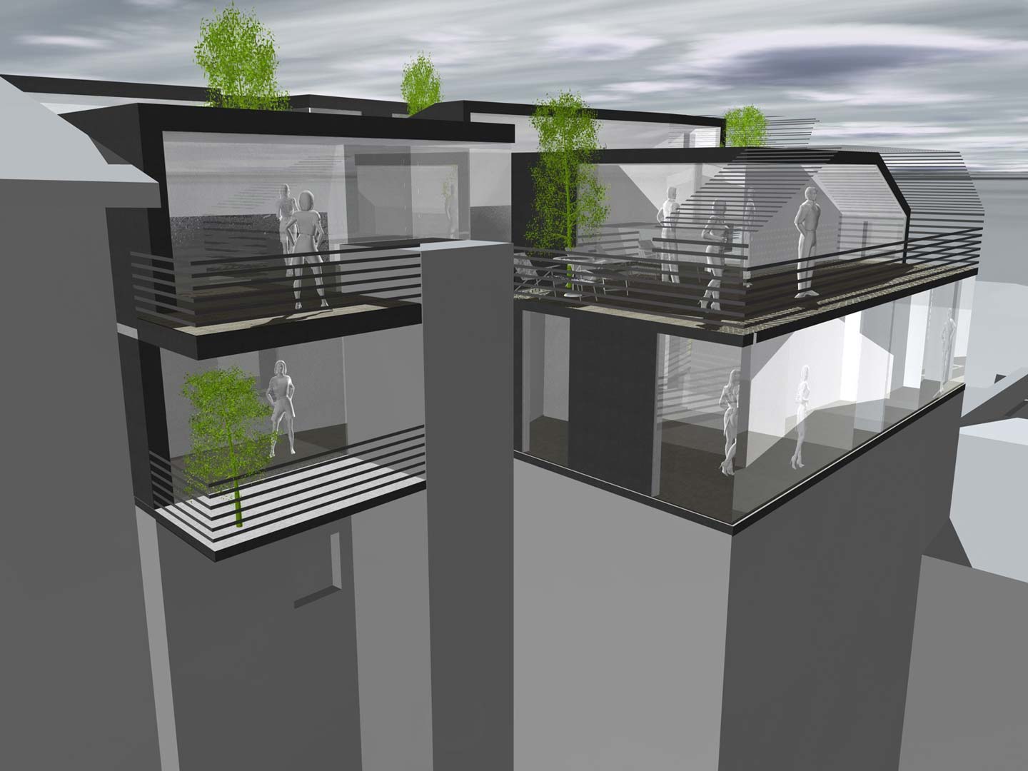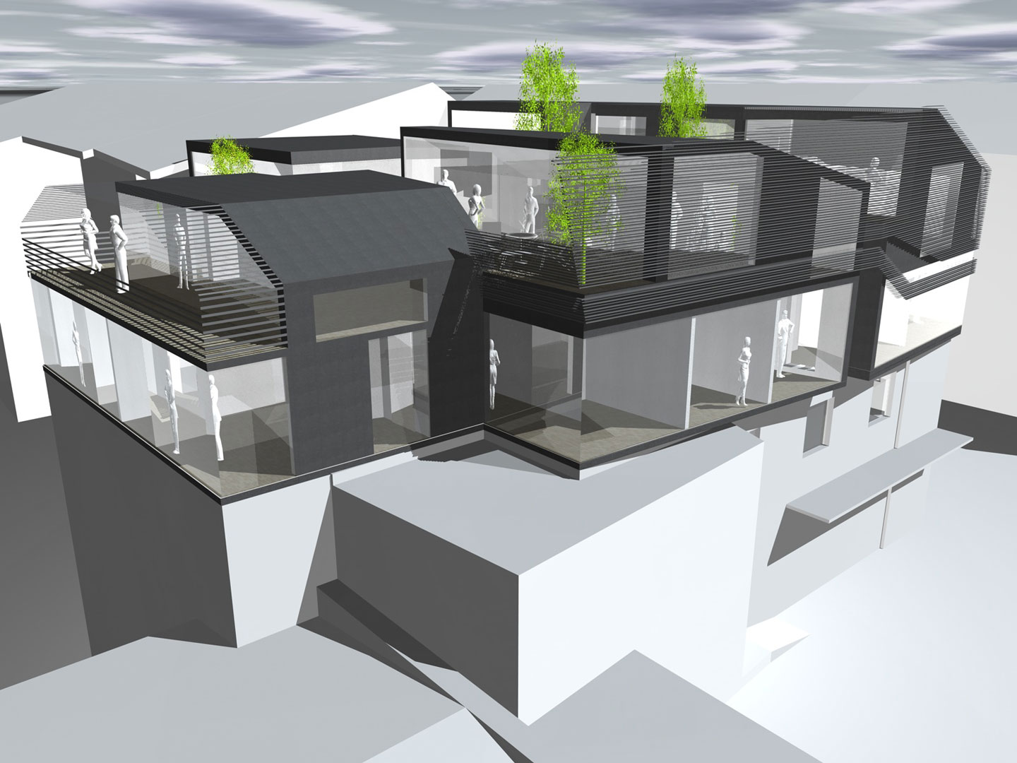 in einem haus aus dem ende des 19ten jahrhunderts werden obergeschoss und dachgeschoss neu gebaut. entstehen sollen 5 duplex-apartmentwohnungen mit dachterrasse. der entwurf organisiert die 5 wohnungen als eigenständige "häuser am dach" mit urbanem charakter.