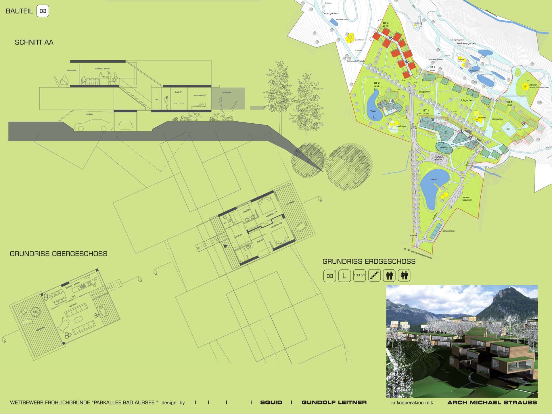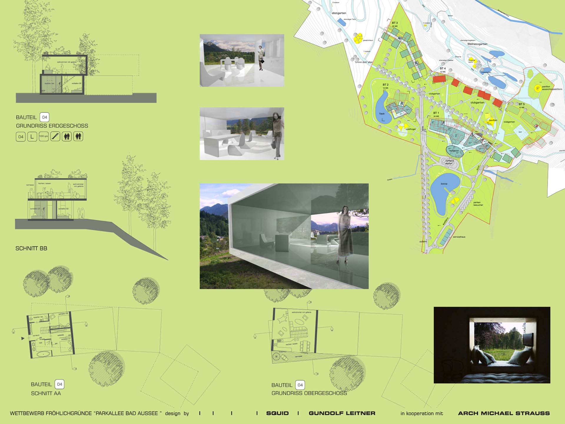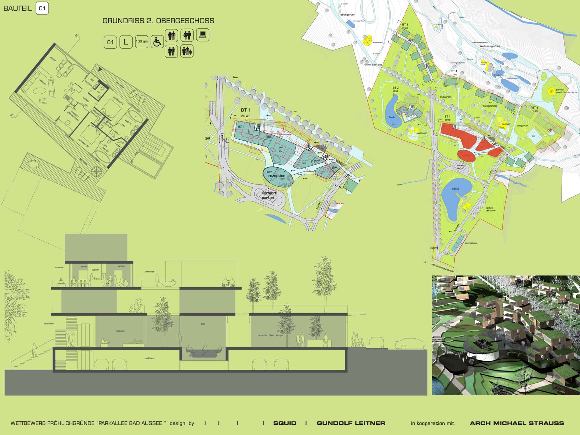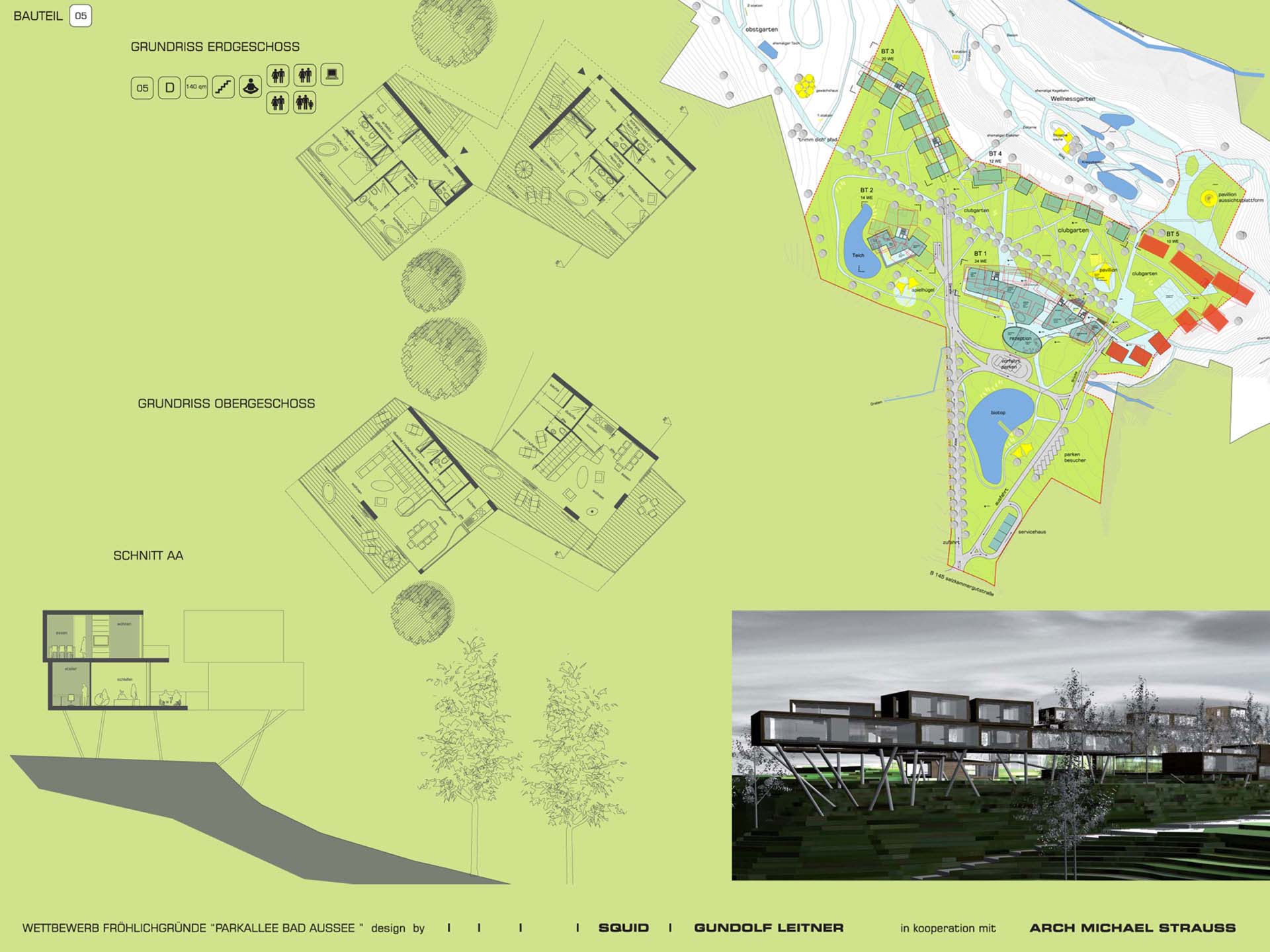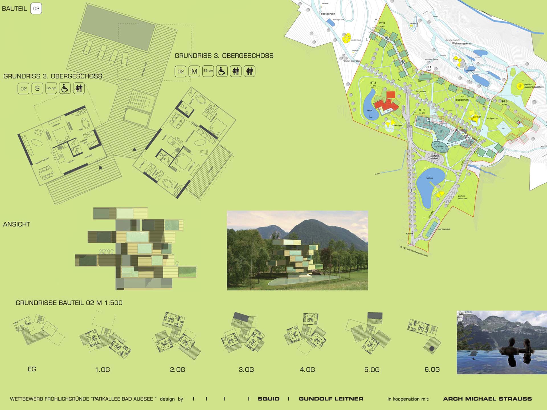 EINSTUFIGER GELADENER IDEEN-WETTBEWERB „ FRÖHLICHGRÜNDE“ BAD AUSSEE 5*+ APARTEMENTANLAGE - PARKALLEE BAD AUSSEE - Bauteil 1: „Club housing“ / 24 Wohneinheiten Vorfahrt, Rezeption mit Backoffice, Verwaltung, Information, Bar, Lounge, Fitness-und Wellness-Bereich, Indoor - Kinderbereich, Lager, Nebenräume - darüber Appartements in den Kategorien SMALL, MEDIUM (2 und 3 - geschossig). Die Parkfläche befindet sich auf Ebene -1. Die Vertikalerschließung erfolgt mit Stiegen und 3 liften Bauteil 2: „Panoramaturm“ / 14 Wohneinheiten Die Appartementwohnungen im Turm sind in den Grössen SMALL und MEDIUM konzipiert. Das Erdgeschoss ist als Servicebereich mit Lounge u. Barbereich, einer temporären Cateringzone sowie ein Backoffice für den Servicebetrieb untergebracht. Das Parking der Bewohner erfolgt in einer Tiefgarage direkt unter dem Turm. Bauteil 3: „Wohnen am Wald“ / 14 - 20 Wohneinheiten Die Bebauung ist 1 bis 3–geschossig und besitz sowohl Appartements über 2 Ebenen als auch eingeschossige Appartements. Die Wohnungen sind auf gegeneinander versetzt situierten Ebenen angeordnet und können variabel kombiniert zu unterschiedlichen wohnungsgrössen kombiniert werden. Die vertikale Erschließung erfolgt über Stiegen und 3 Lifte. Die Parkebene ist um 1,5m gegenüber dem gelände abgesenkt und befindet sich direkt unter dem gebäude. Bauteil 4: „Chalet housing“ Ein- und zweigeschossige Bebauung der Kategorien SMALL und MEDIUM an der nördlichen Geländekante, die in einem terrassierten Hang zum Moosgraben abfällt. Die PKW Stellplätzte für diese Appartements befinden sich im zentralen Bauteil 1. Die Erschließung erfolgt fußläufig durch den Park2 bzw. mit Elektro-Caddys. (Gepäckzulieferung – Servicedienste, etc.). Hier entsteht ein ruhiges, intimes Wohnen mit besonders direkten Naturkontakt. Bauteil 5: „Pent housing“ Exponierte Baukörper, die über der Geländekante in Richtung Bad Aussee Zentrum schweben. Das Abheben der Baukörper vom Boden ermöglicht die ungehinderte Durchsicht aus der Parkanlage Richtung Ortszentrum und öffnet somit den Park. Als Wohnungskategorien werden hier MEDIUM, LAGE und LUXURY angeboten. Die Stellplätze befinden sich zentral vor den Baukörpern und sind ca. 2 m vom Geländeniveau abgesenkt. Die Überdachung der Stellfläche ist begehbar, teilweise begrünt und mit einem Wasserbecken versehen. Die Erschließung der Appartements erfolgt über die erhöhte Verteilerebene + 3.5 m, die über Stiegen und einen Lift erreicht werden kann.