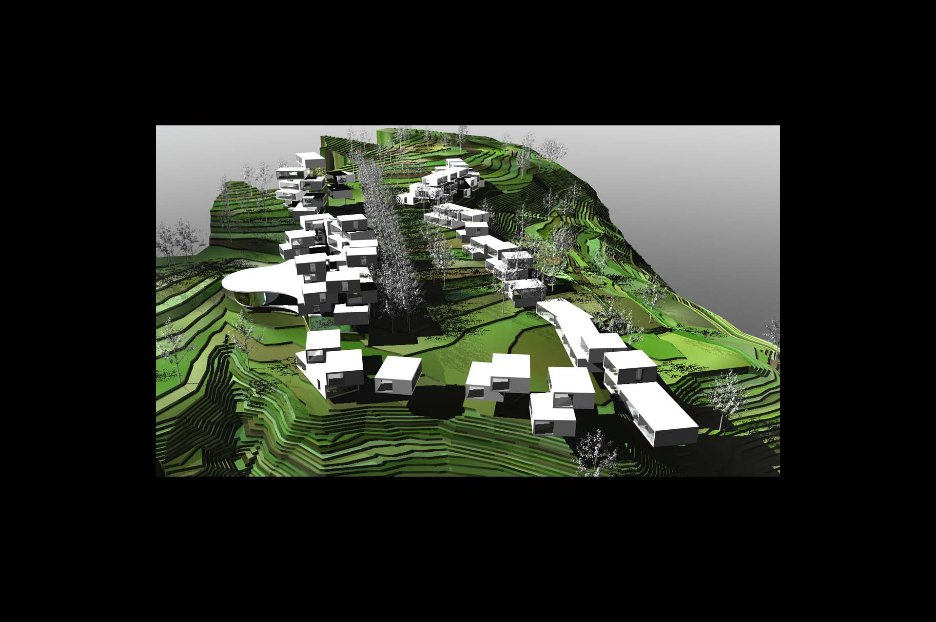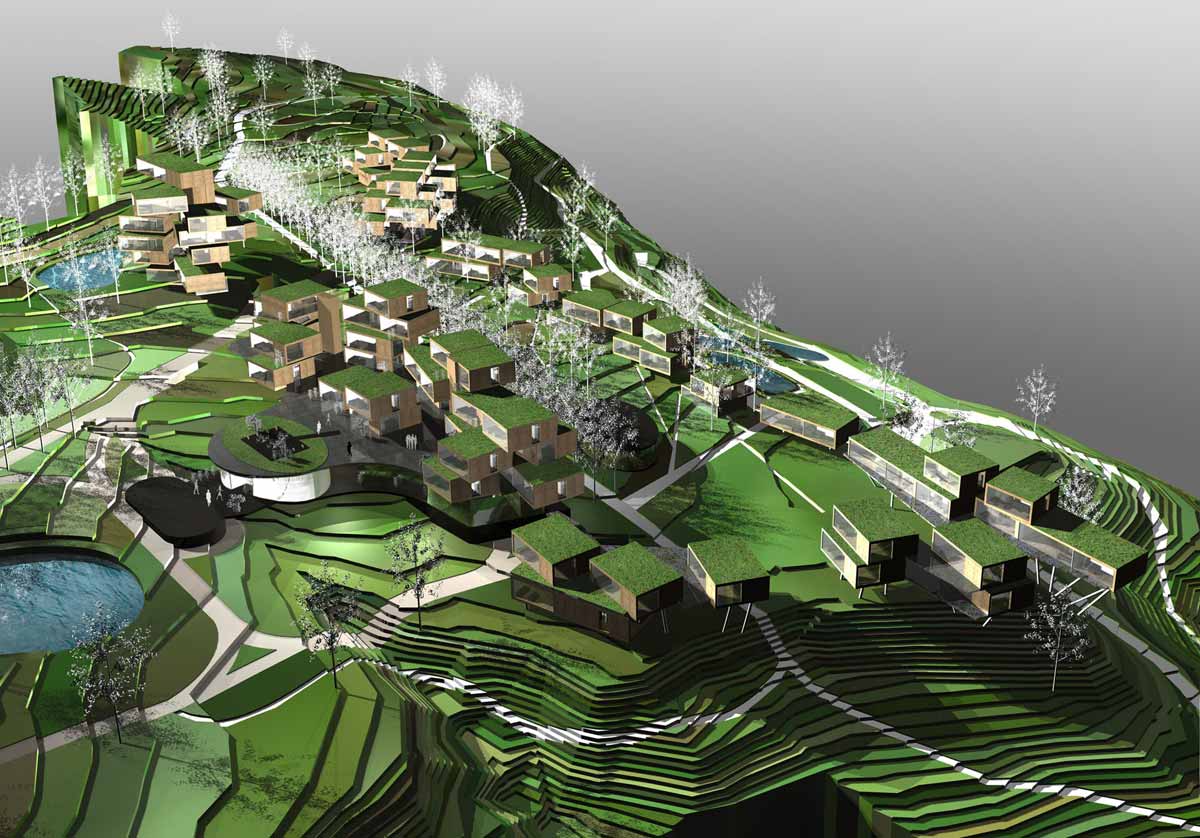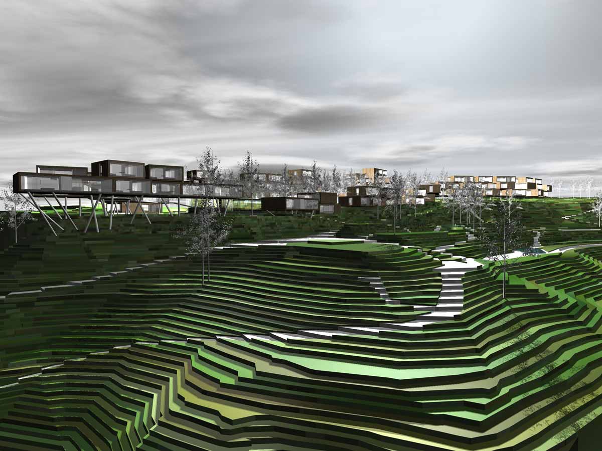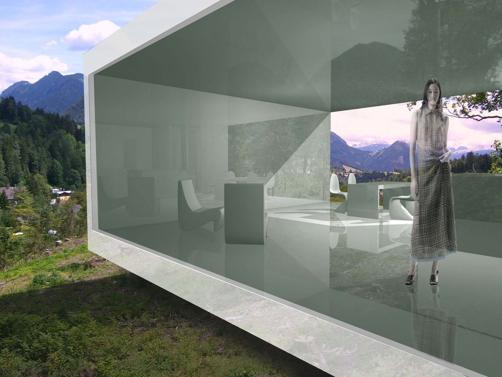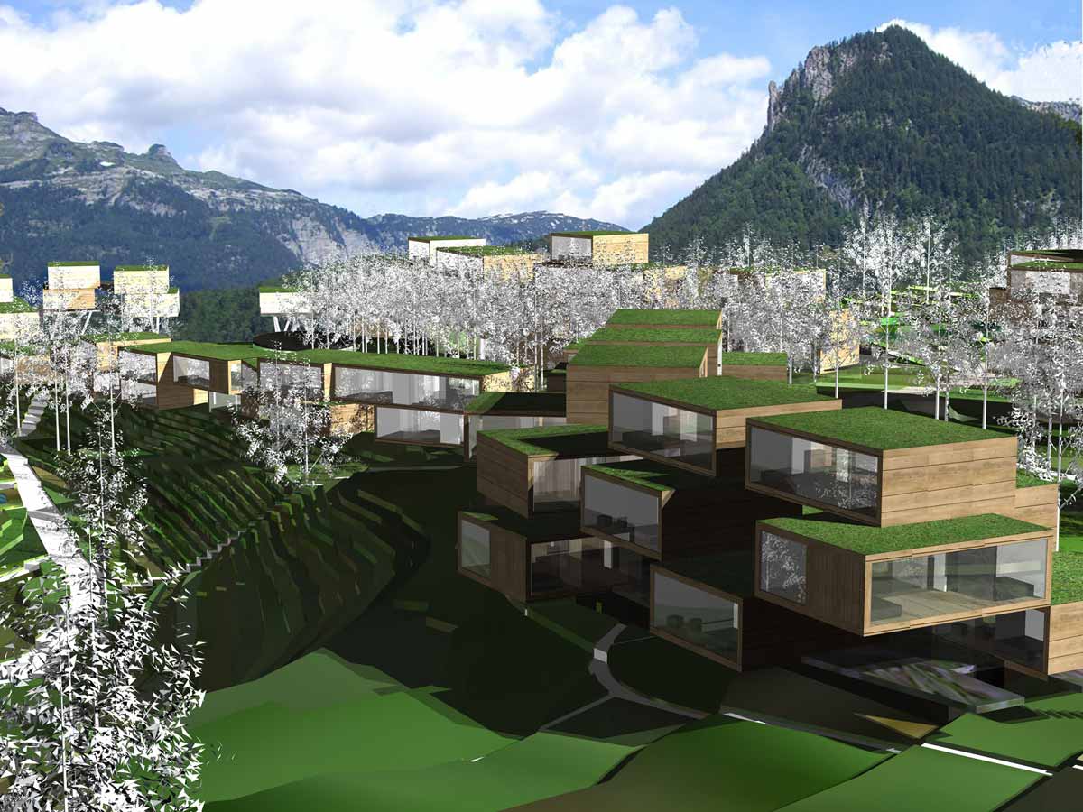 EINSTUFIGER GELADENER IDEEN-WETTBEWERB „ FRÖHLICHGRÜNDE“ BAD AUSSEE 5*+ APARTEMENTANLAGE - PARKALLEE BAD AUSSEE - Bauteil 1: „Club housing“ / 24 Wohneinheiten Vorfahrt, Rezeption mit Backoffice, Verwaltung, Information, Bar, Lounge, Fitness-und Wellness-Bereich, Indoor - Kinderbereich, Lager, Nebenräume - darüber Appartements in den Kategorien SMALL, MEDIUM (2 und 3 - geschossig). Die Parkfläche befindet sich auf Ebene -1. Die Vertikalerschließung erfolgt mit Stiegen und 3 liften Bauteil 2: „Panoramaturm“ / 14 Wohneinheiten Die Appartementwohnungen im Turm sind in den Grössen SMALL und MEDIUM konzipiert. Das Erdgeschoss ist als Servicebereich mit Lounge u. Barbereich, einer temporären Cateringzone sowie ein Backoffice für den Servicebetrieb untergebracht. Das Parking der Bewohner erfolgt in einer Tiefgarage direkt unter dem Turm. Bauteil 3: „Wohnen am Wald“ / 14 - 20 Wohneinheiten Die Bebauung ist 1 bis 3–geschossig und besitz sowohl Appartements über 2 Ebenen als auch eingeschossige Appartements. Die Wohnungen sind auf gegeneinander versetzt situierten Ebenen angeordnet und können variabel kombiniert zu unterschiedlichen wohnungsgrössen kombiniert werden. Die vertikale Erschließung erfolgt über Stiegen und 3 Lifte. Die Parkebene ist um 1,5m gegenüber dem gelände abgesenkt und befindet sich direkt unter dem gebäude. Bauteil 4: „Chalet housing“ Ein- und zweigeschossige Bebauung der Kategorien SMALL und MEDIUM an der nördlichen Geländekante, die in einem terrassierten Hang zum Moosgraben abfällt. Die PKW Stellplätzte für diese Appartements befinden sich im zentralen Bauteil 1. Die Erschließung erfolgt fußläufig durch den Park2 bzw. mit Elektro-Caddys. (Gepäckzulieferung – Servicedienste, etc.). Hier entsteht ein ruhiges, intimes Wohnen mit besonders direkten Naturkontakt. Bauteil 5: „Pent housing“ Exponierte Baukörper, die über der Geländekante in Richtung Bad Aussee Zentrum schweben. Das Abheben der Baukörper vom Boden ermöglicht die ungehinderte Durchsicht aus der Parkanlage Richtung Ortszentrum und öffnet somit den Park. Als Wohnungskategorien werden hier MEDIUM, LAGE und LUXURY angeboten. Die Stellplätze befinden sich zentral vor den Baukörpern und sind ca. 2 m vom Geländeniveau abgesenkt. Die Überdachung der Stellfläche ist begehbar, teilweise begrünt und mit einem Wasserbecken versehen. Die Erschließung der Appartements erfolgt über die erhöhte Verteilerebene + 3.5 m, die über Stiegen und einen Lift erreicht werden kann.