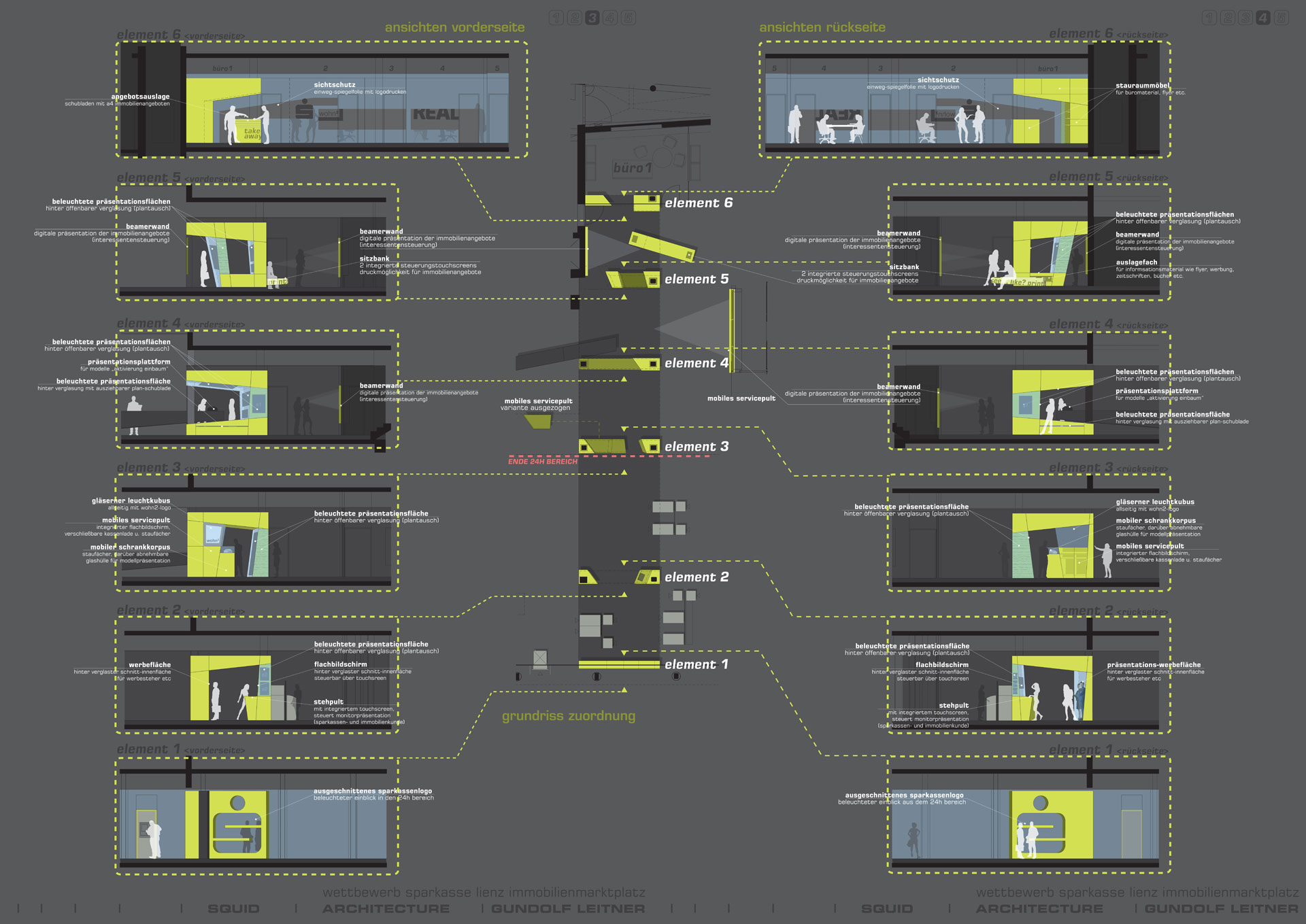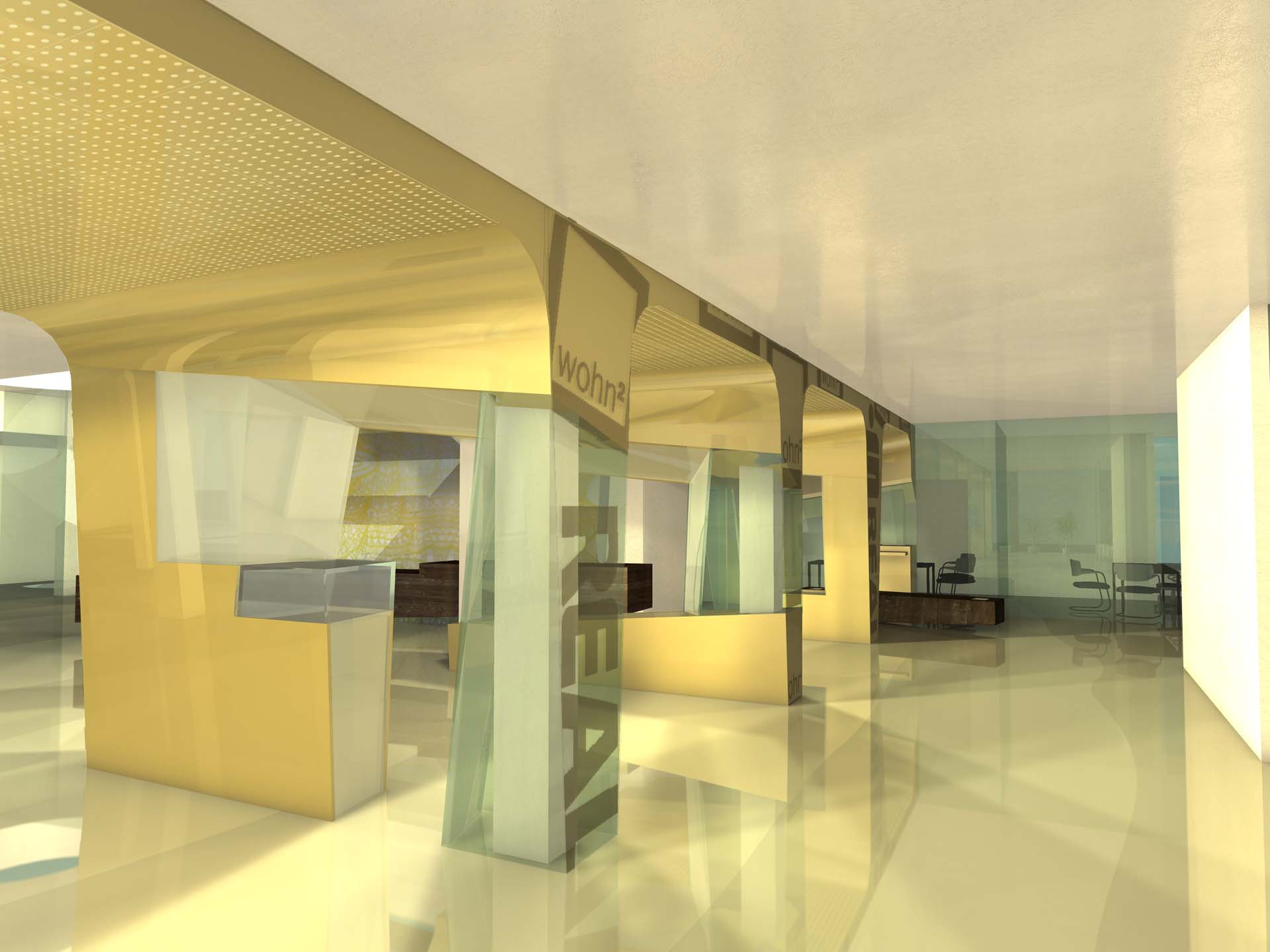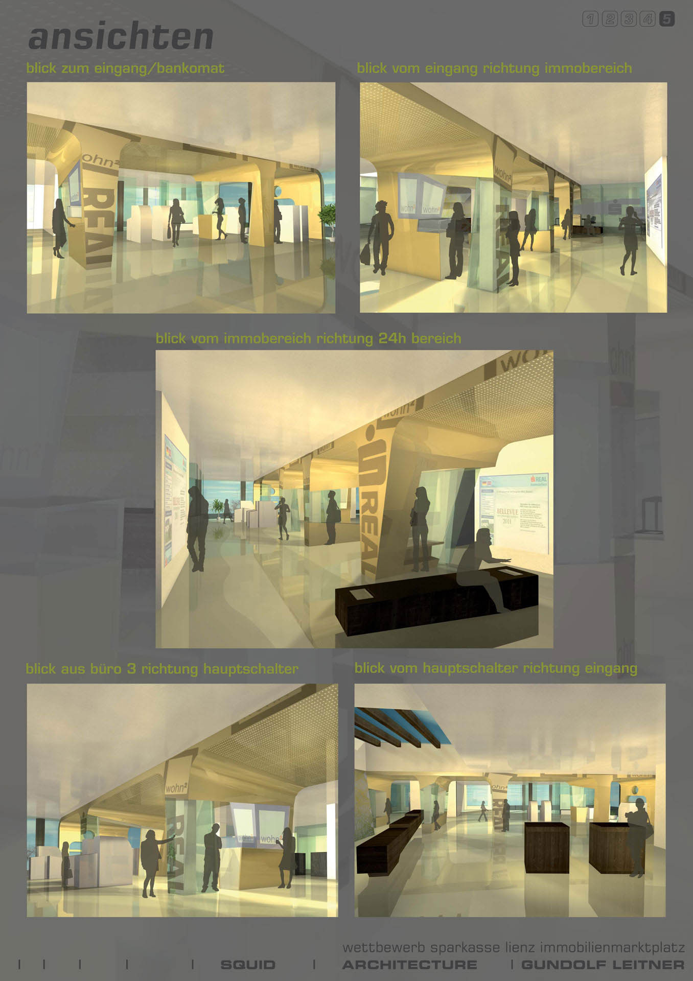 neugestaltung der kassenhalle im zentralgebäude der lienzer sparkassen ag Der bisher für diskrete Privatkundenberatungen vorgesehene Bereich soll zu einem „Marktplatz“ für alle Immobiliengeschäfte umgestaltet werden. Die dort tätigen Mitarbeiter bieten ein „Komplett-Service rund um das Thema Bauen & Wohnen". (Wohnung, Haus, oder Grundstück - kaufen, verkaufen, mieten oder finanzieren) Es sollte Freiraum und Präsentationsmöglichkeit für Immobilienangebote geschaffen werden. wettbewerbsvorgabe - zeitgenössische, moderne Innenraumgestaltung - der neu zu gestaltende Bereich sollte „Eigenständigkeit“ und „Individualität“ besitzen, aber trotzdem mit dem bestehenden Filialdesign harmonieren. - die bestehenden fünf Beratungszimmer sollten in ihrer raumbildenden Struktur möglichst nicht verändert werden - Berücksichtigung von Logo‘s und CI der Sparkasse bzw. der Fachabteilungen (sReal, Wohn², Sparkasse) – siehe Beilage