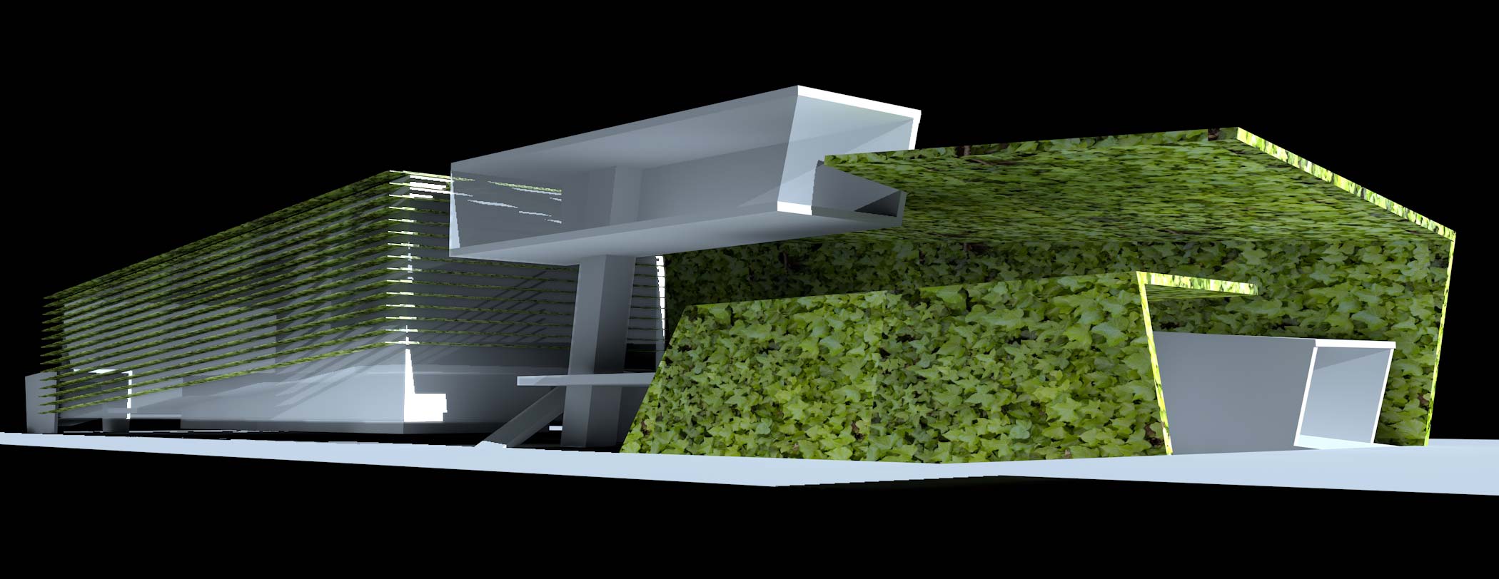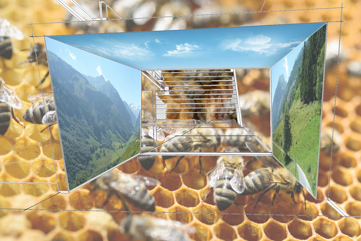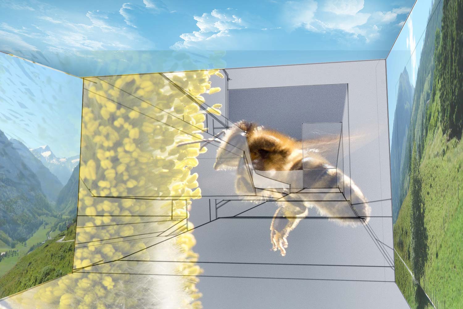 Die Bodenplatte ist die „Balanceplattform“ . Die Decke bewegt sich synchron zum Boden – allerdings mit dem Faktor 10 im Verhältnis zum Boden. Die Innenwände sind mit Membranen bespannt und bilden mit der Decke eine raumumfassende Projektionsfläche für Videos. Die Fassade des „Cube“ bewegt sich in synchronem Rhythmus zum Innenraum. Die lamellenartige Konstruktion hängt an Kettenlinien.