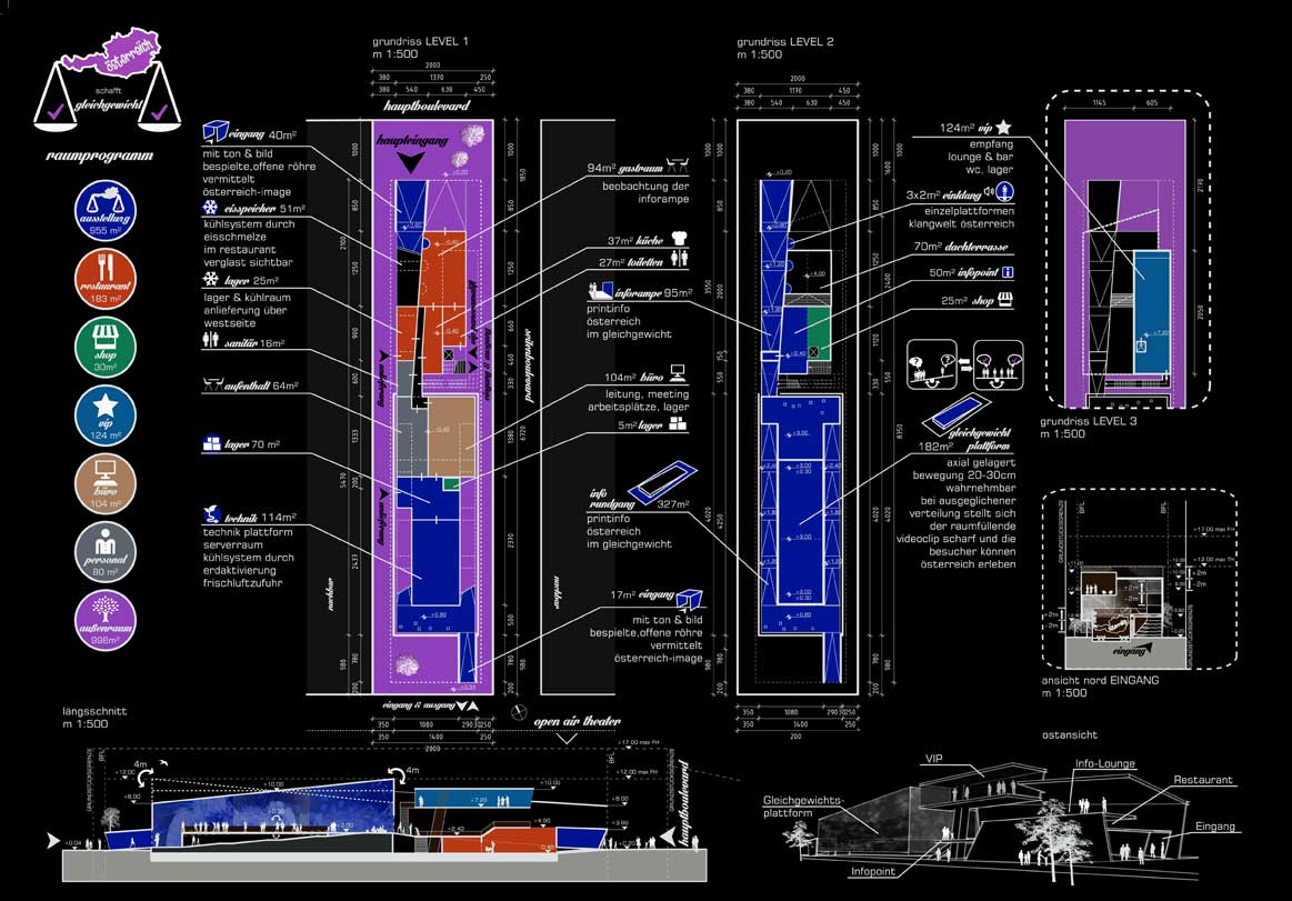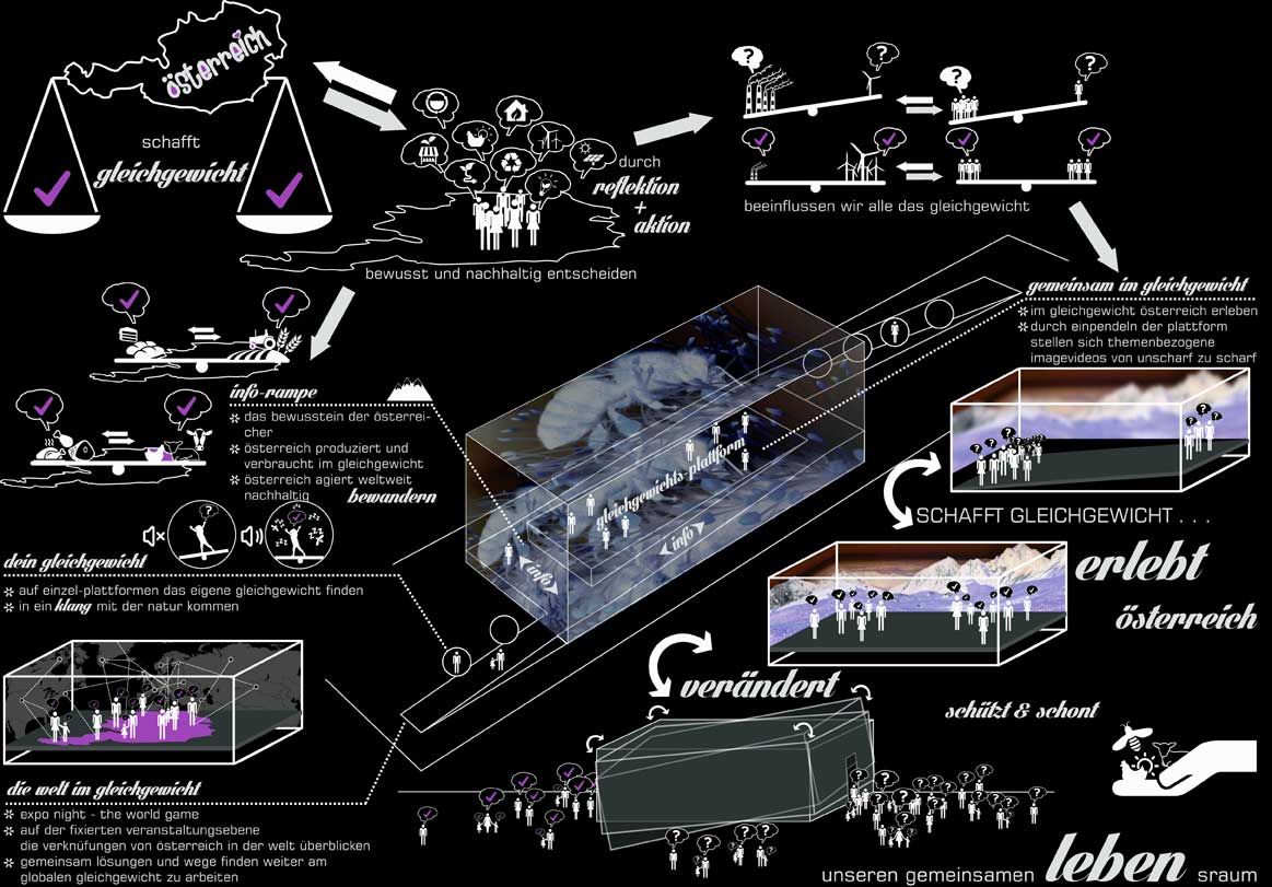 Österreich schafft Gleichgewicht durch bewusste und nachhaltige Entscheidungen.Dem Besucher soll auf einfache und nachhaltige Weise vermittelt werden, dass für ein Gleichgewicht der Systeme – im kleinen wie im großen Maßstab - sowohl die Entscheidungen jedes einzelnen, wie auch der Gruppe (bis hin zur globalen Gemeinschaft) wichtig sind.