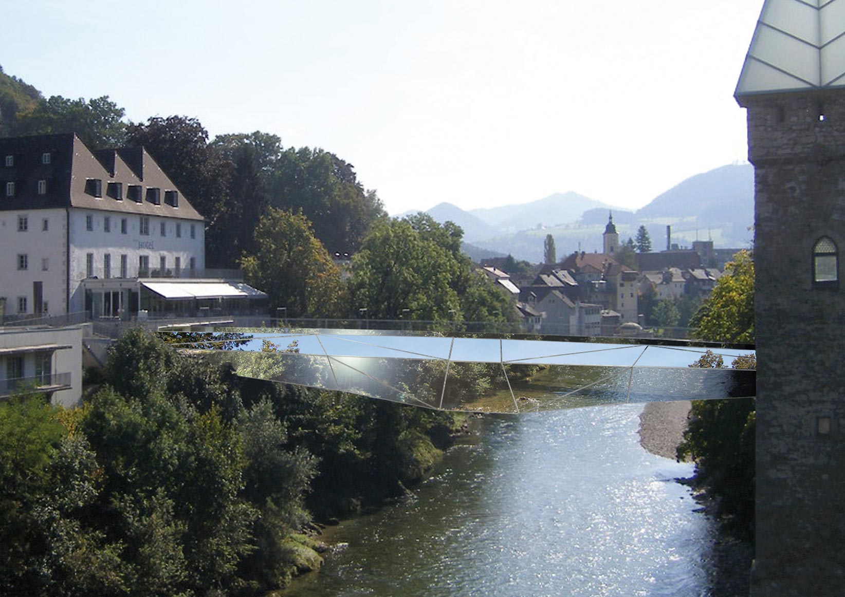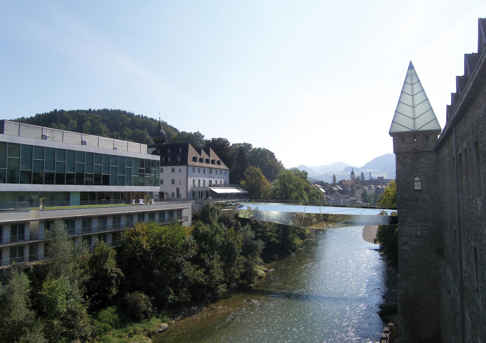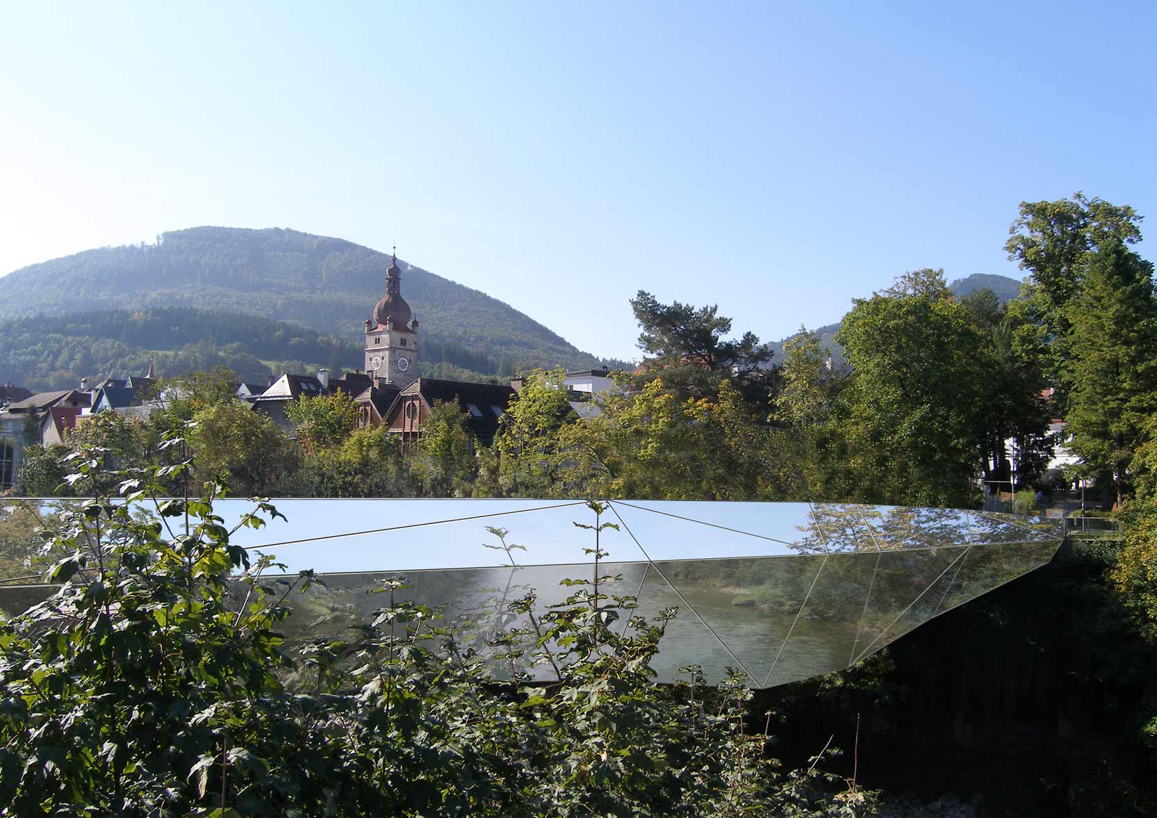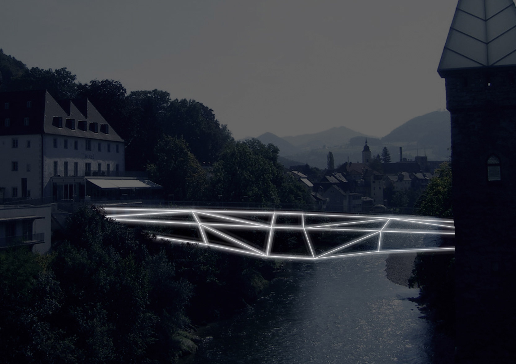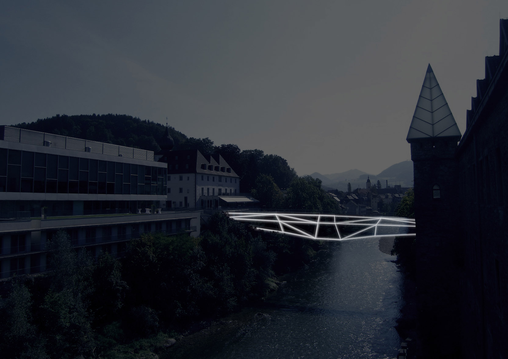The Schlosssteg is a pedestrian and cycle bridge that crosses the Ybbs in the area of the old town of Waidhofen. The supporting structure creates a direct connection between Waidhofen Castle on the side of the Old Town and the Schlosshotel. FORM AND APPEARANCE The new bridge reacts formally to the surrounding buildings, represents the modern and "reflects" the historical. The reflective, slightly crystalline surface takes up the facets of the surroundings and thus forms a visual missing-link. It changes its appearance depending on the point of view, time of day and lighting situation. In the evening and night hours, the bridge is reduced to a grid-shaped light object and thus dematerialises itself. SURFACE, MATERIAL and COLOUR CONCEPTS Primary support structure: Galvanised steel Secondary structure: (substructure for Alucobond) galvanised steel Running board: wood (BSH) Pavement: Gussasphalt slip-resistant Surface material: (outside) Alucobond 6mm - mounted on the secondary structure. LIGHTING CONCEPT Outdoor lighting: LED strips Interior lighting: (sidewalk lighting) LED strips
