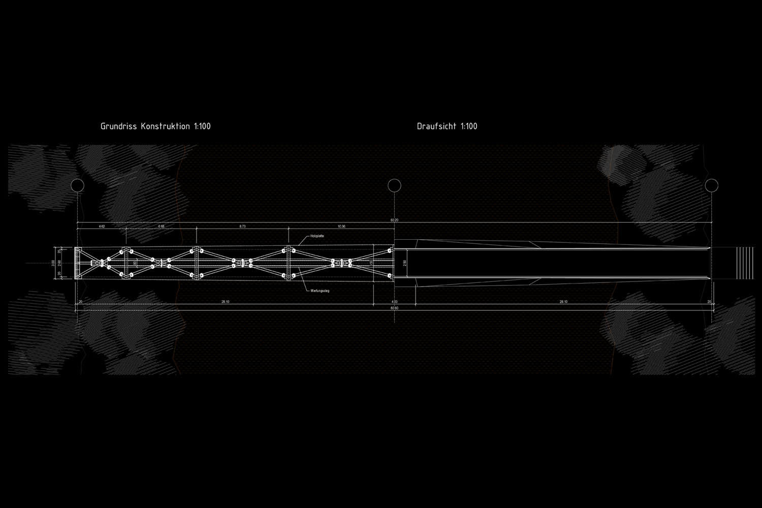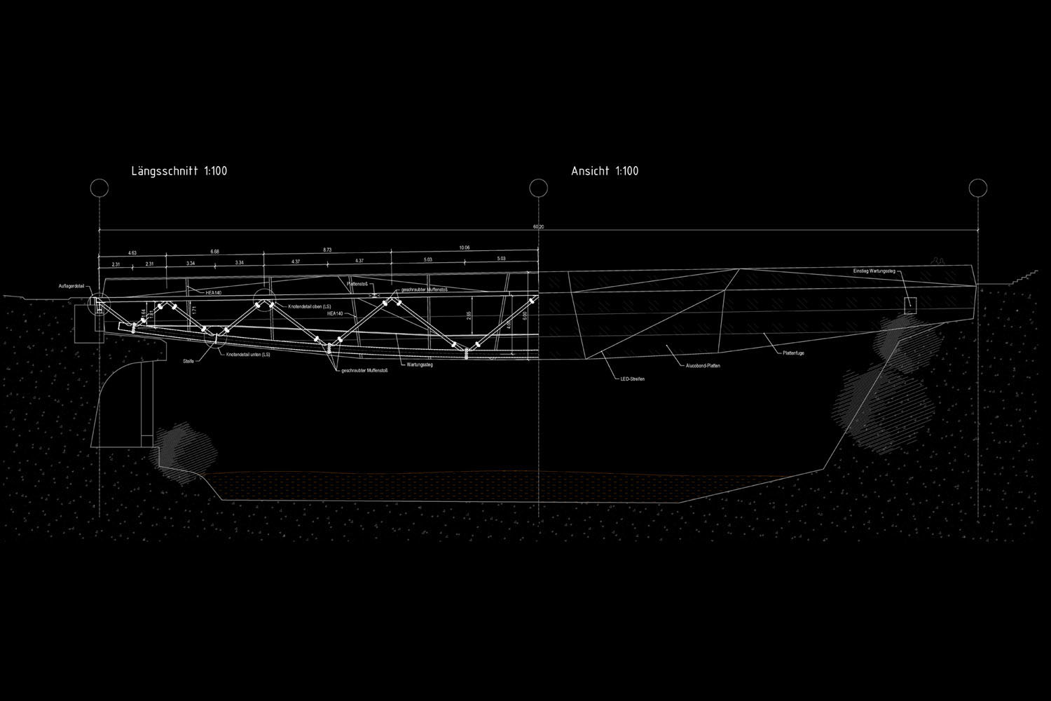 Bei dem Schlosssteg handelt es sich um eine Fuß- und Radwegbrücke die im Bereich der Altstadt von Waidhofen die Ybbs quert. Das Tragwerk schafft eine direkte Verbindung zwischen dem Schloss Waidhofen auf Seite der Altstadt und dem Schlosshotel. FORM UND ERSCHEINUNG Die neue Brücke reagiert formal auf die umgebenden Bauten, repräsentiert das Moderne und „spiegelt“ das Historische wieder. Die reflektierende, leicht kristalline Oberfläche nimmt die Facetten der Umgebung auf, und bildet somit ein visuelles missing-link. Sie verändert ihr Aussehen, je nach Betrachtungspunkt, Tageszeit und Lichtsituation. In den Abend- und Nachtstunden reduziert sich die Brücke auf ein gitterförmiges Lichtobjekt und entmaterialisiert sich damit. OBERFLÄCHEN-, MATERIAL- und FARBKONZEPT Primärtragstruktur: Stahl verzinkt Sekundärstruktur: (Unterkonstruktion für Alucobond) Stahl verzinkt Laufplatte: Holz (BSH) Gehbelag: Gussasphalt rutschfest Oberflächenmaterial: (aussen) Alucobond 6mm - montiert auf der Sekundstruktur. BELEUCHTUNGSKONZEPT Aussenbeleuchtung: LED-Bänder Innenbeleuchtung: (Gehwegbeleuchtung) LED-bänder