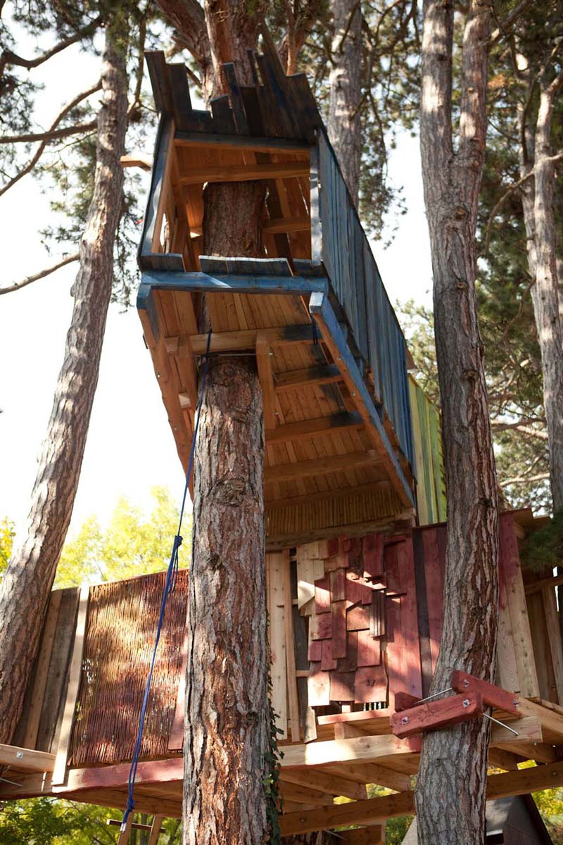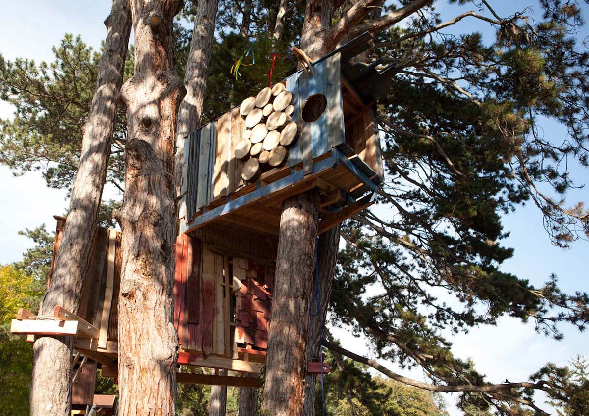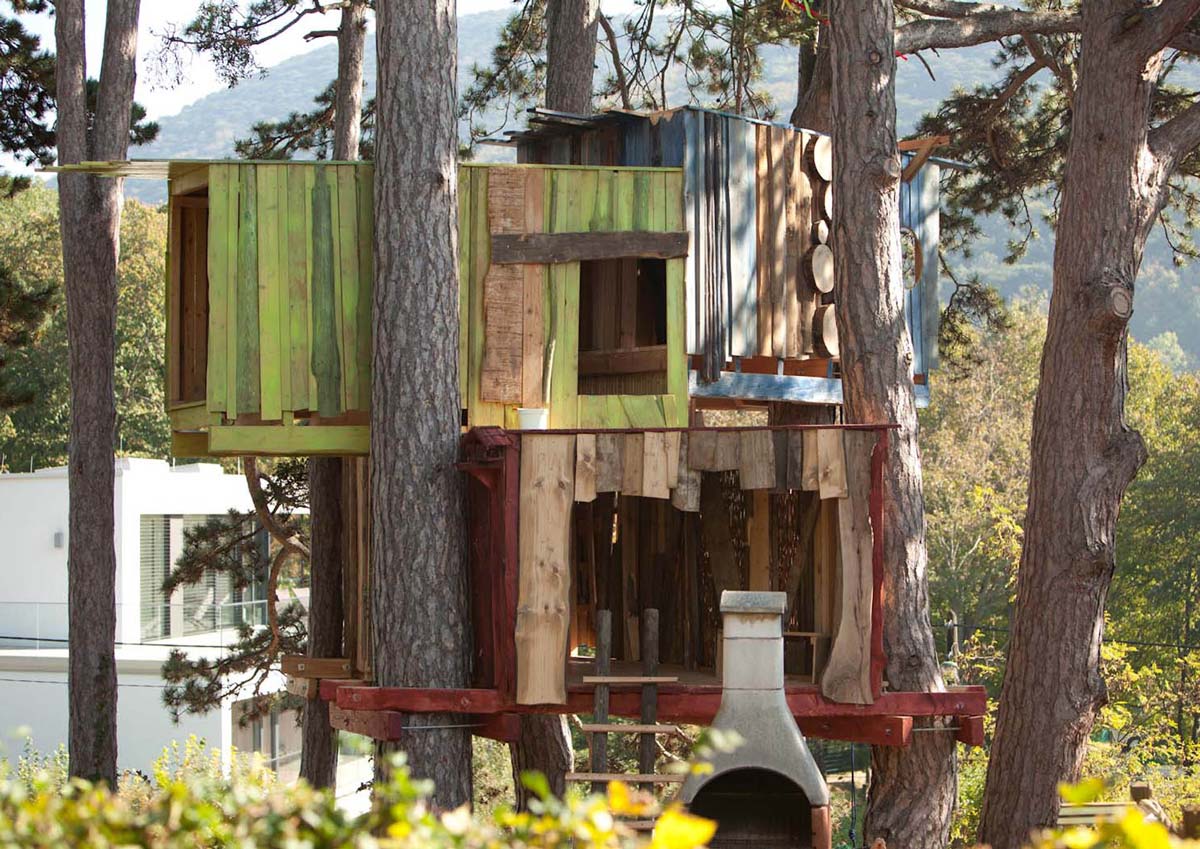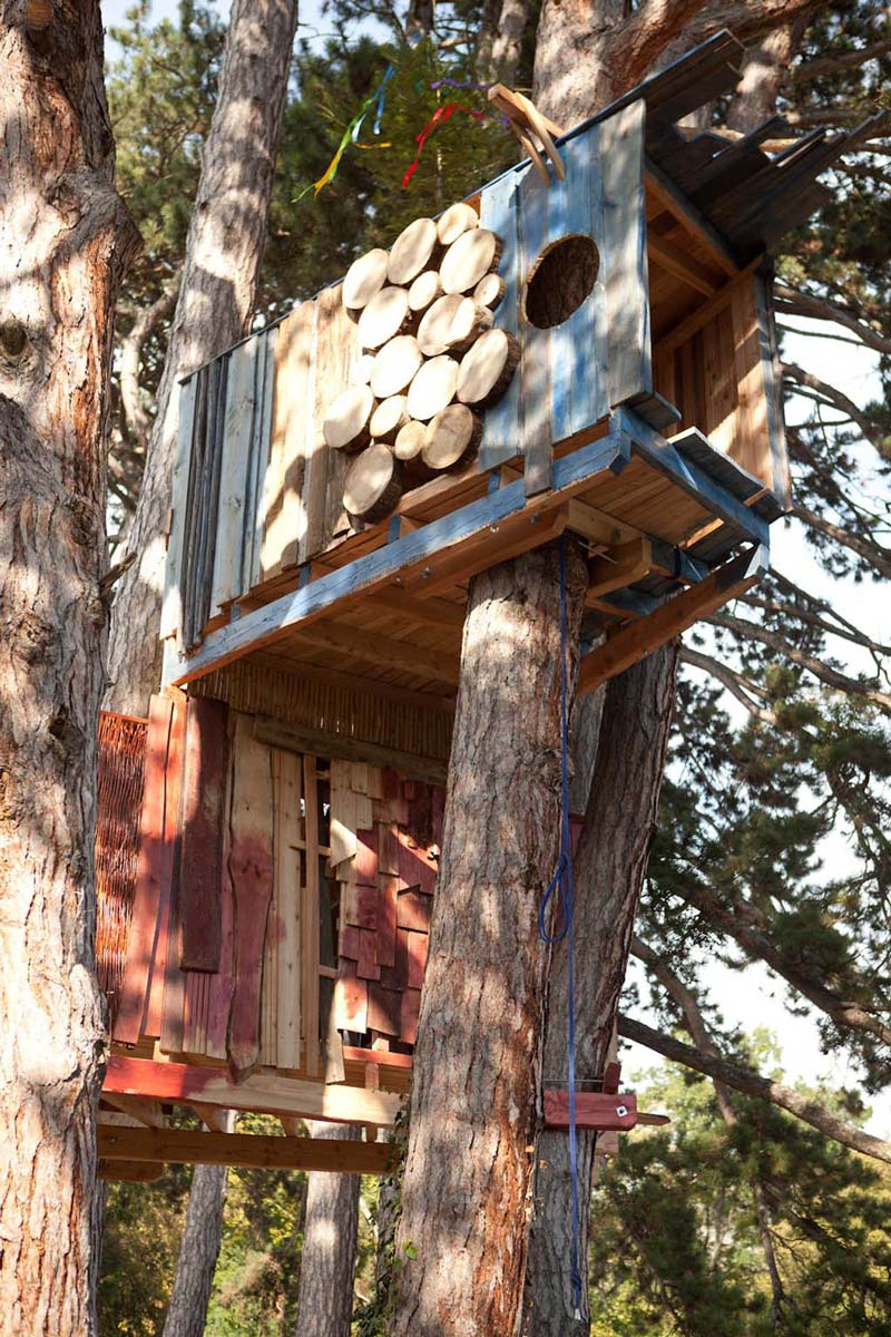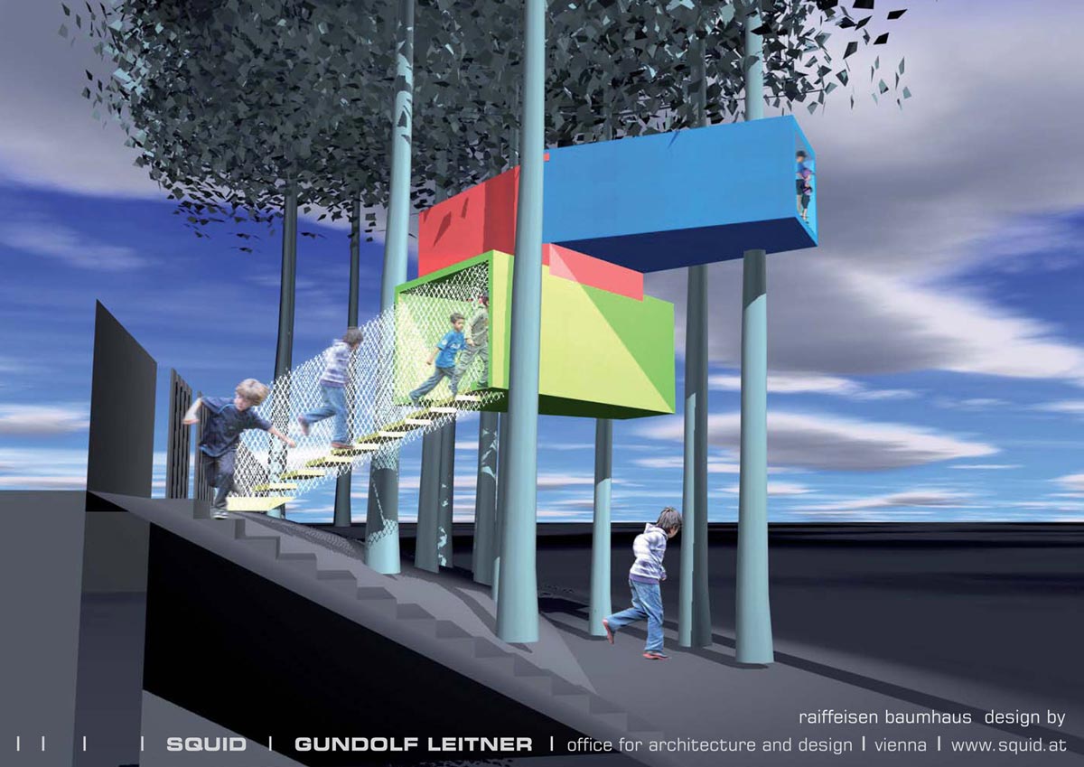 das baumhaus wurde für raiffeisen werbefilmaufnahmen entworfen und gebaut und nach abschluss der dreharbeiten dem sos-kinderdorf / hinterbrühl bei wien zur nutzung als spielbereich für die kinder überlassen.