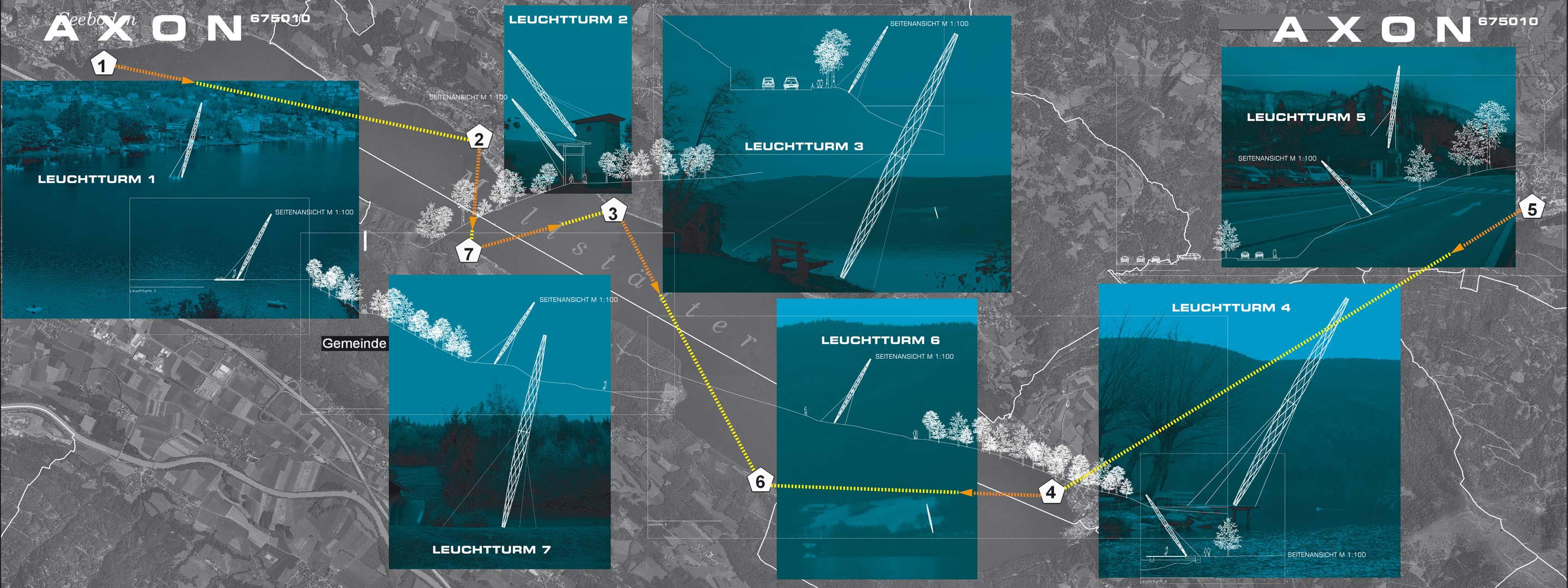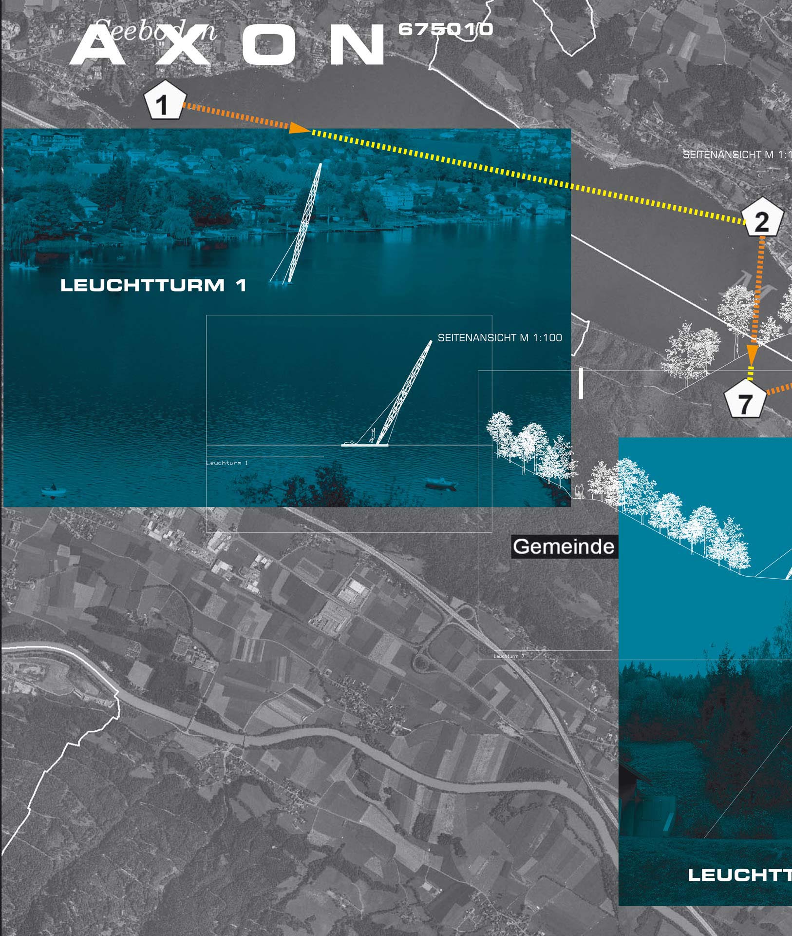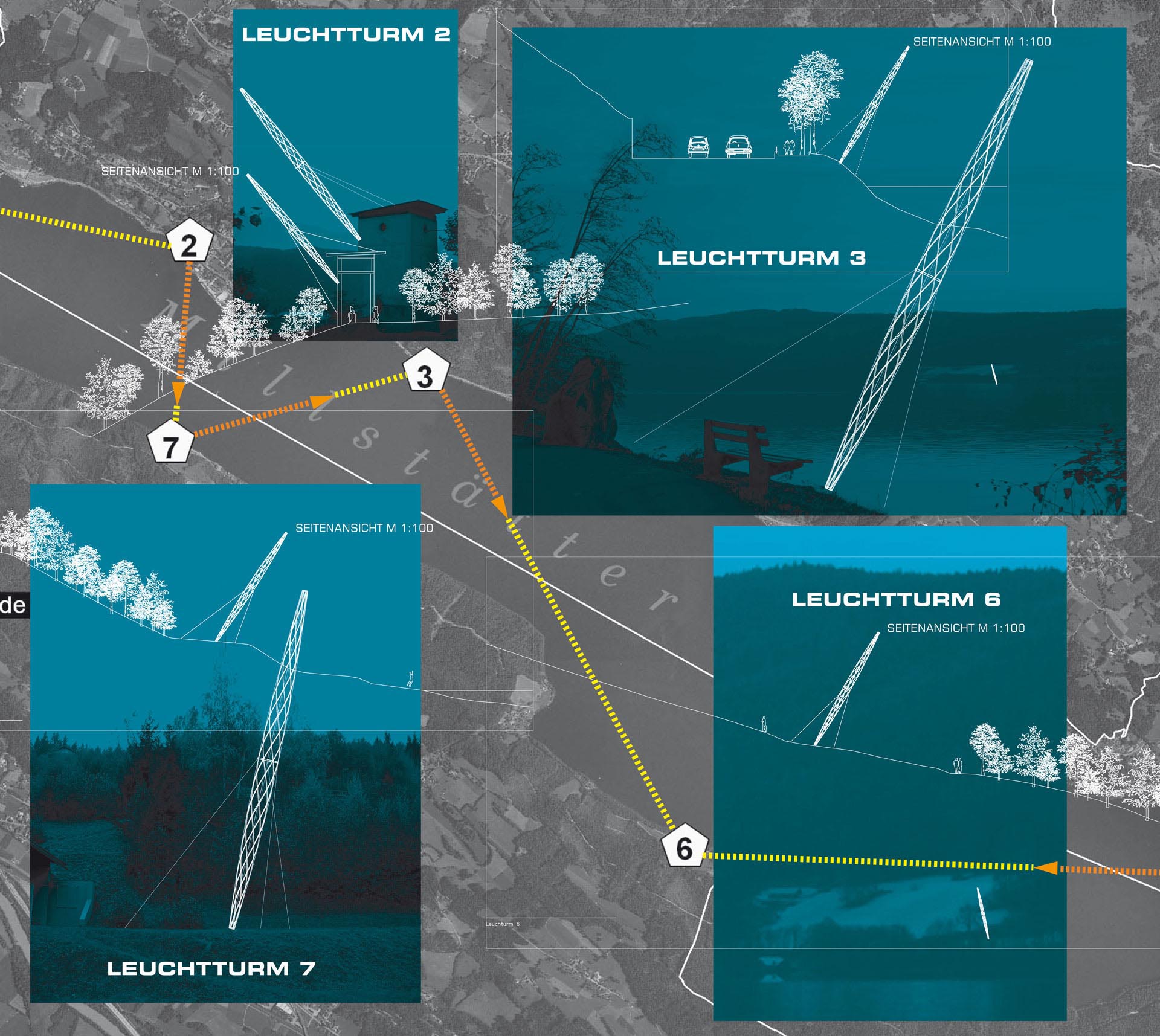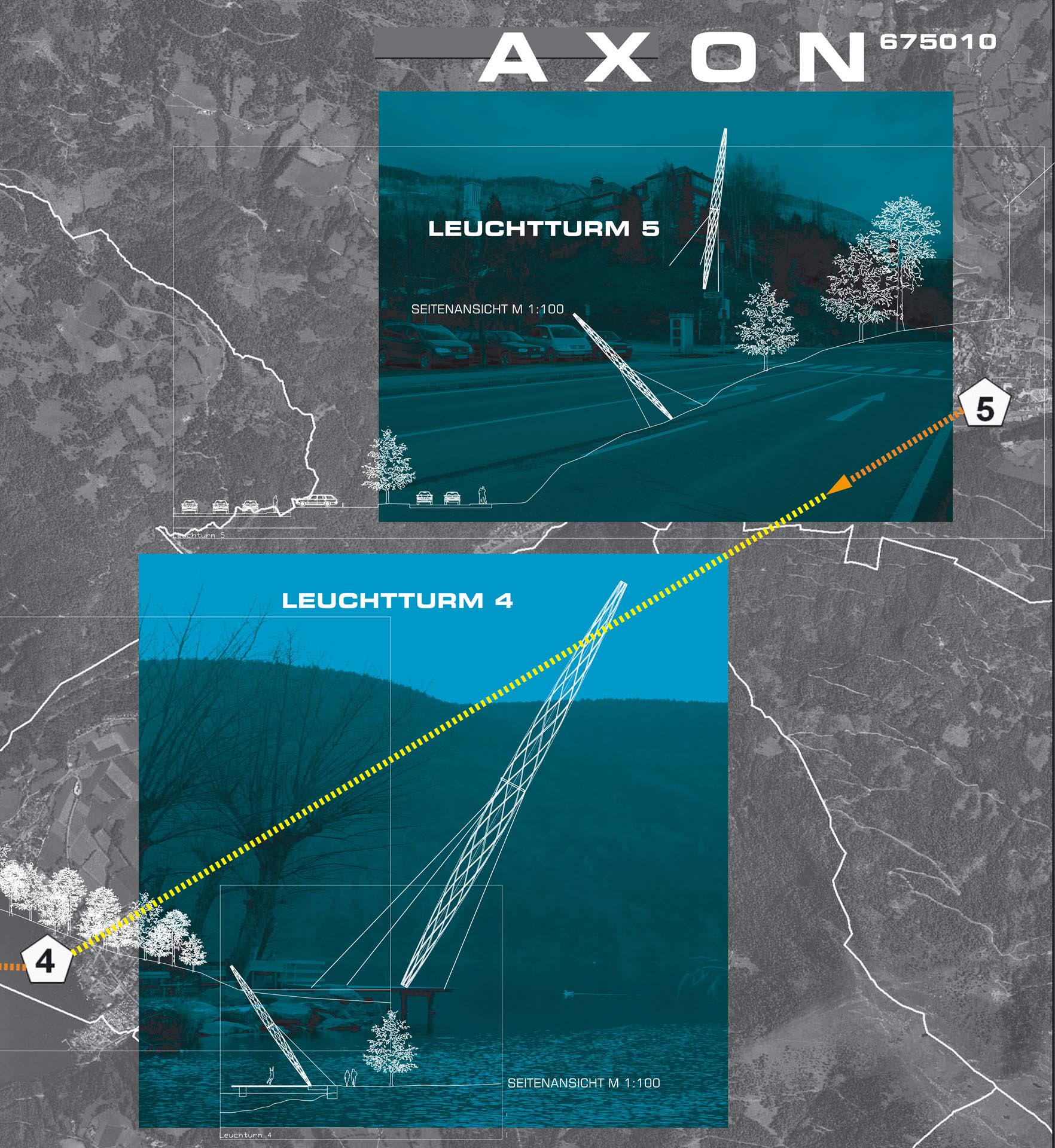 grundgedanke war die vernetzung der einzelnen standorte. diese imaginaere struktur wird durch die ausrichtung der einzelstaebe und die wechselseitige visuelle verbindung (ausgenommen standort radenthein) vermittelt.
